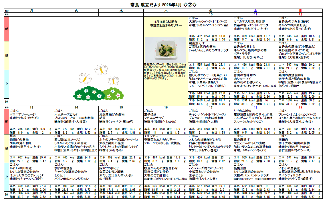 2026.04.01 お食事 4月の献立♬ Tweet シェアする 4月の献立をお伝えします☆彡 優っくり村下馬 杉原 前の記事 2026.04.04 お食事 【体操】今日の体操ᕦ(ò_óˇ)ᕤ 次の記事 2026.03.29 お食事 【地域交流】団地の桜まつり 一覧へ戻る
