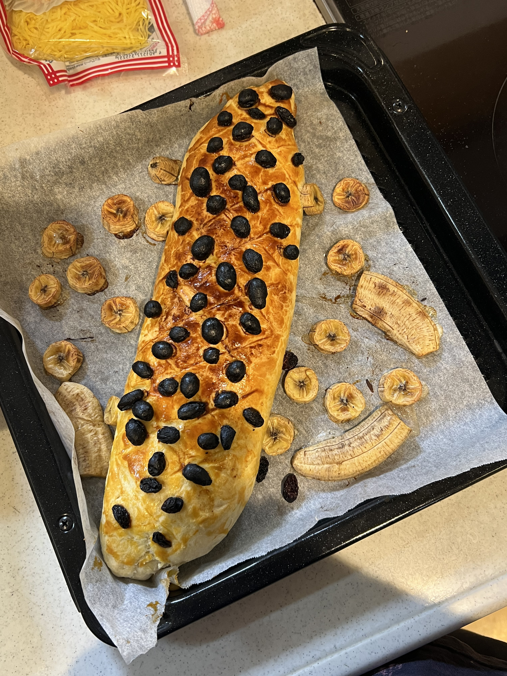 バナナを切ったり、生地にのせたりする作業は無理のない動きで行え、自然と手先を使う訓練にもなります。完成したパイは、焼きたての香ばしい香りと甘いバナナの風味で、皆さまから「おいしいね」と笑顔があふれました。