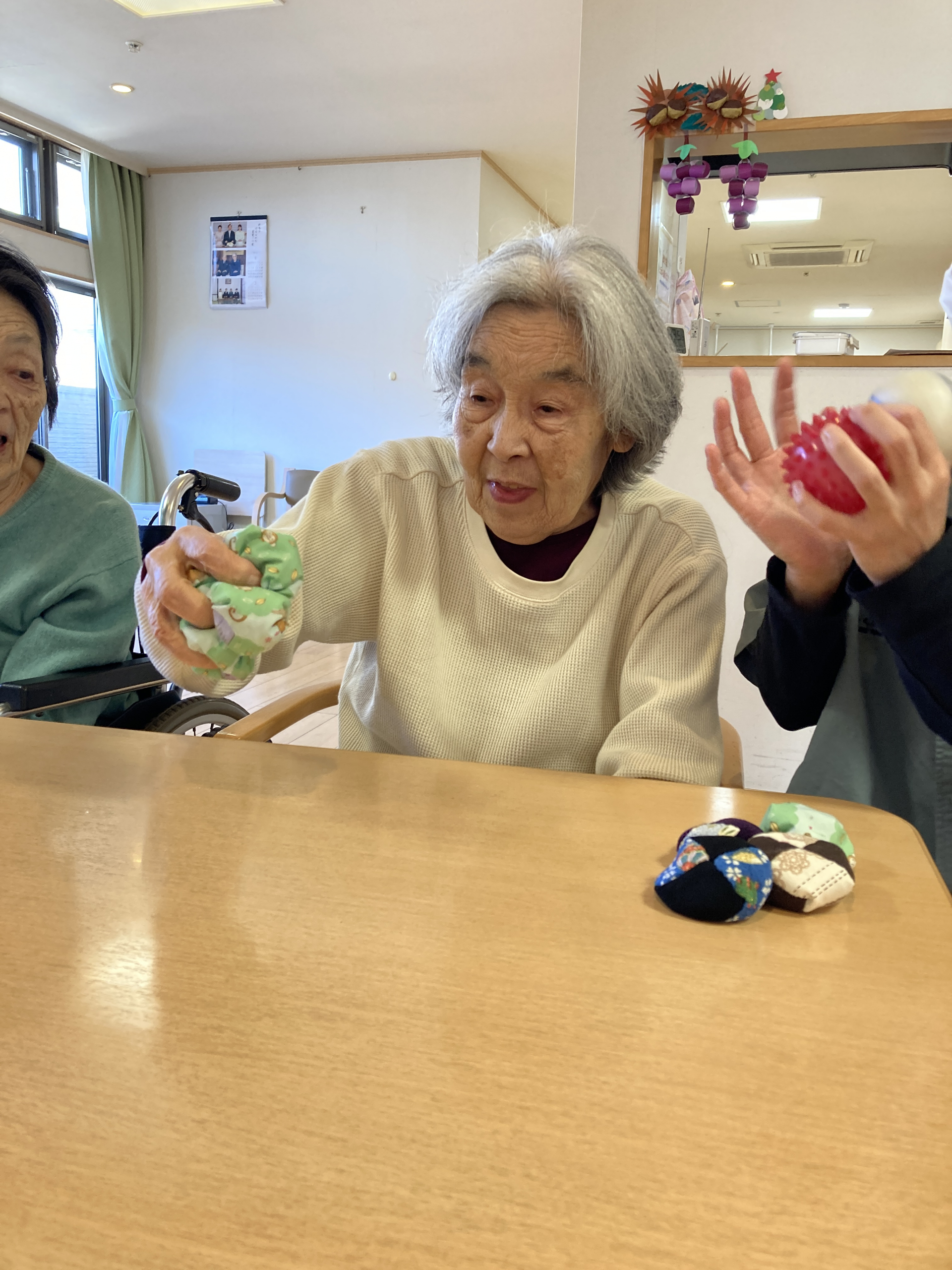 今回はお手玉を使用したリハビリを考えてくださいました。手を使う作業は脳の活性化にもつながります。
