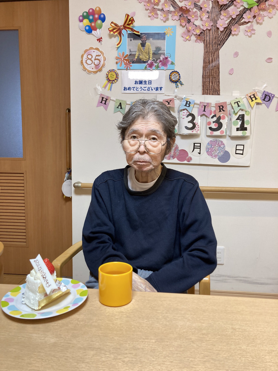 スタッフや他の利用者様と一緒に「おめでとうございます」と声掛けると、少し照れながらも嬉しそうな笑顔を見せてくださいました。ささやかではありましたが、ケーキやお祝いの言葉を贈り、心温まるひとときを過ごすことができました。