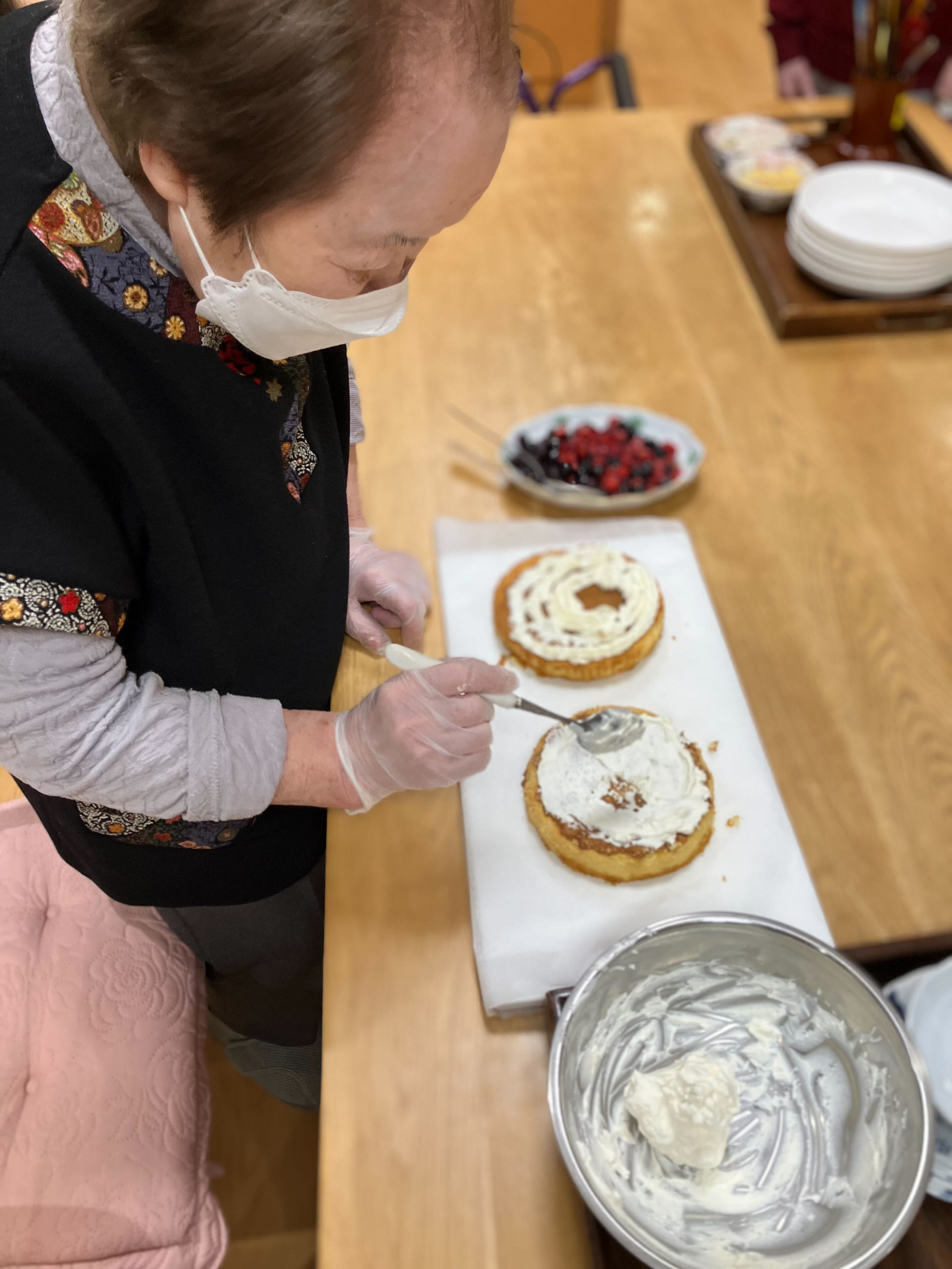 ケーキの生地を混ぜるところから、色とりどりのベリーやクリームで飾り付けをするまで、入居者の皆さんは笑顔と笑い声に包まれながら参加しました。