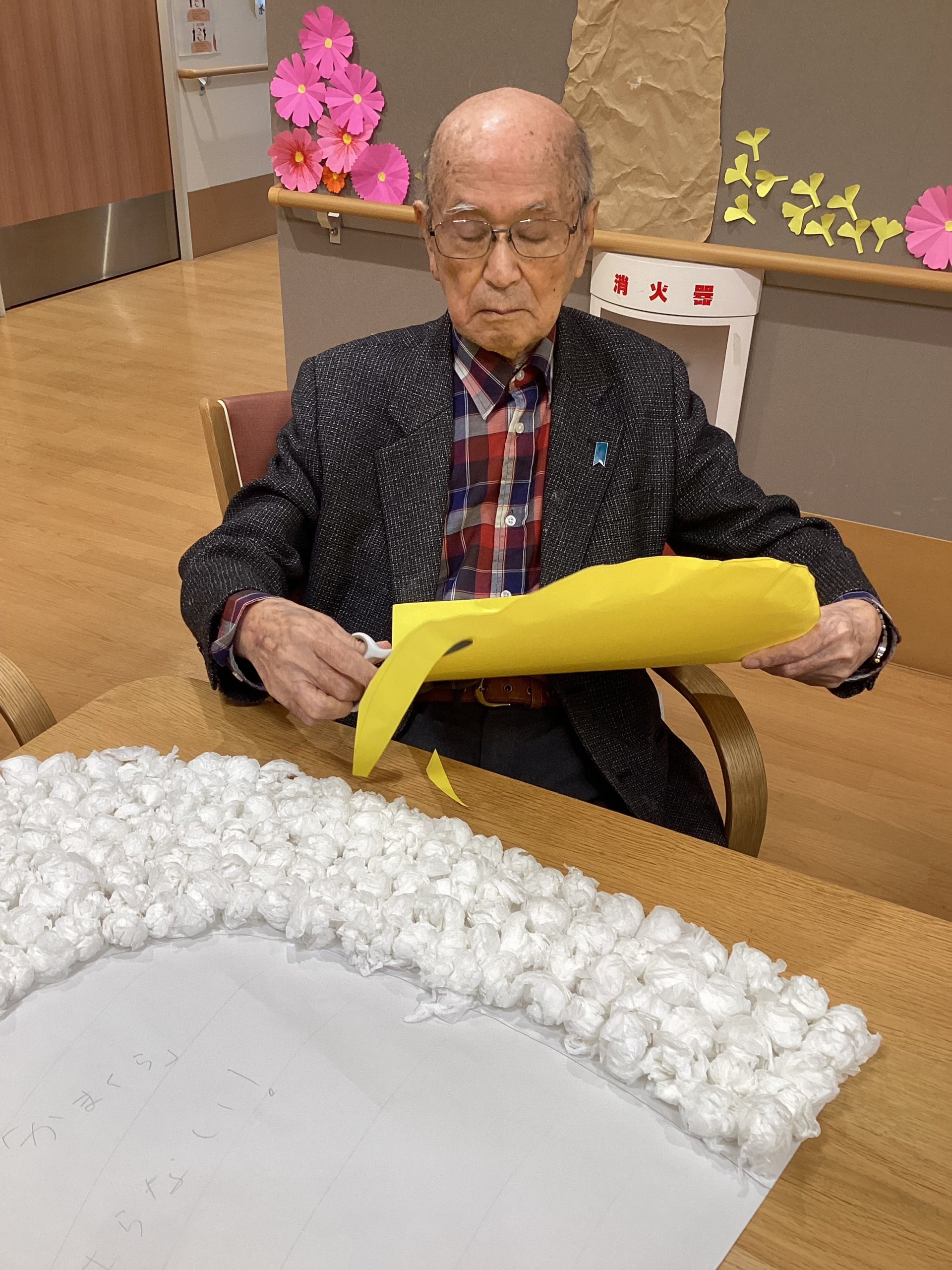 利用者様と職員たちの協力し合って、こんな素敵な冬らしい飾り完成です。