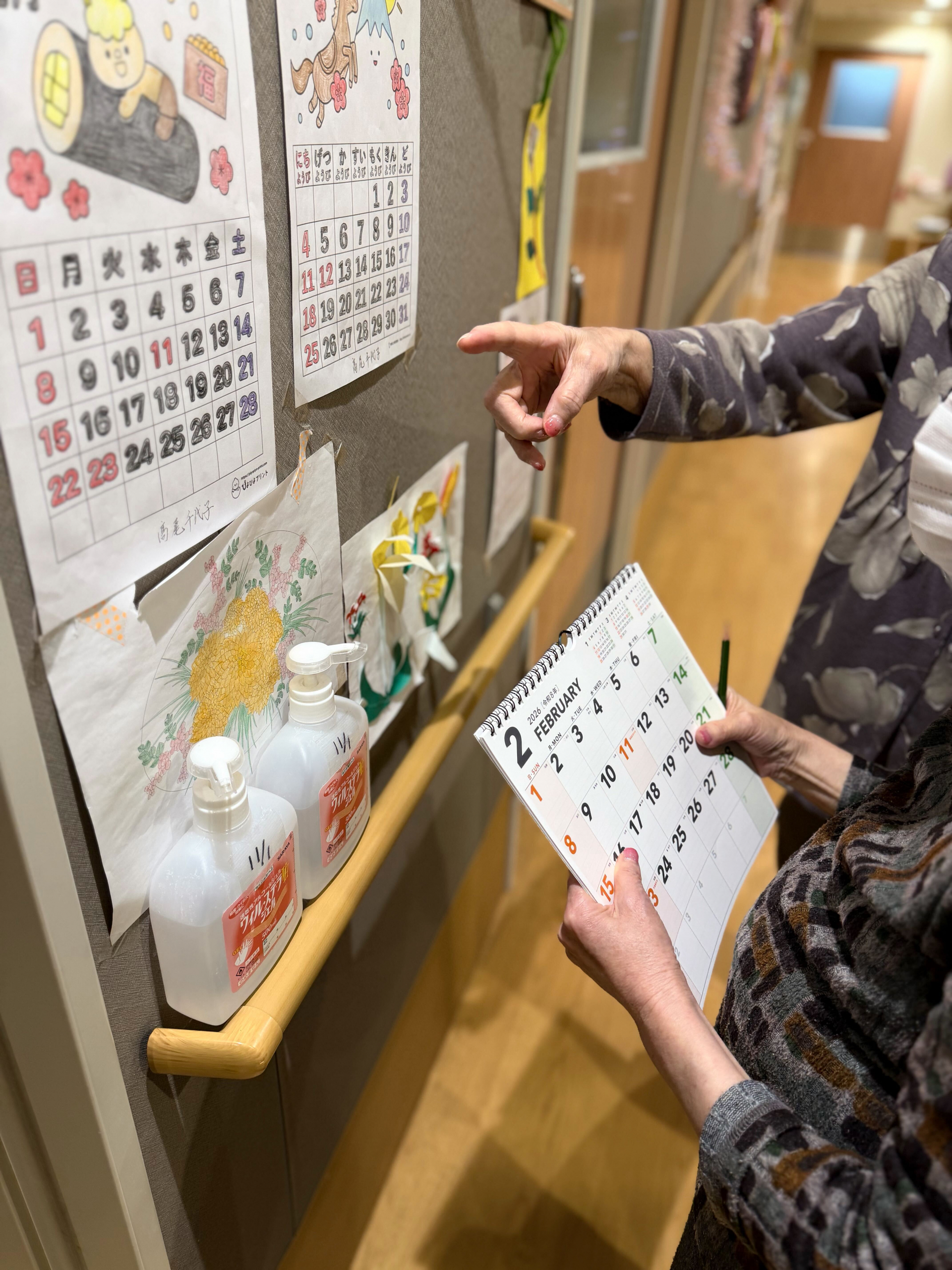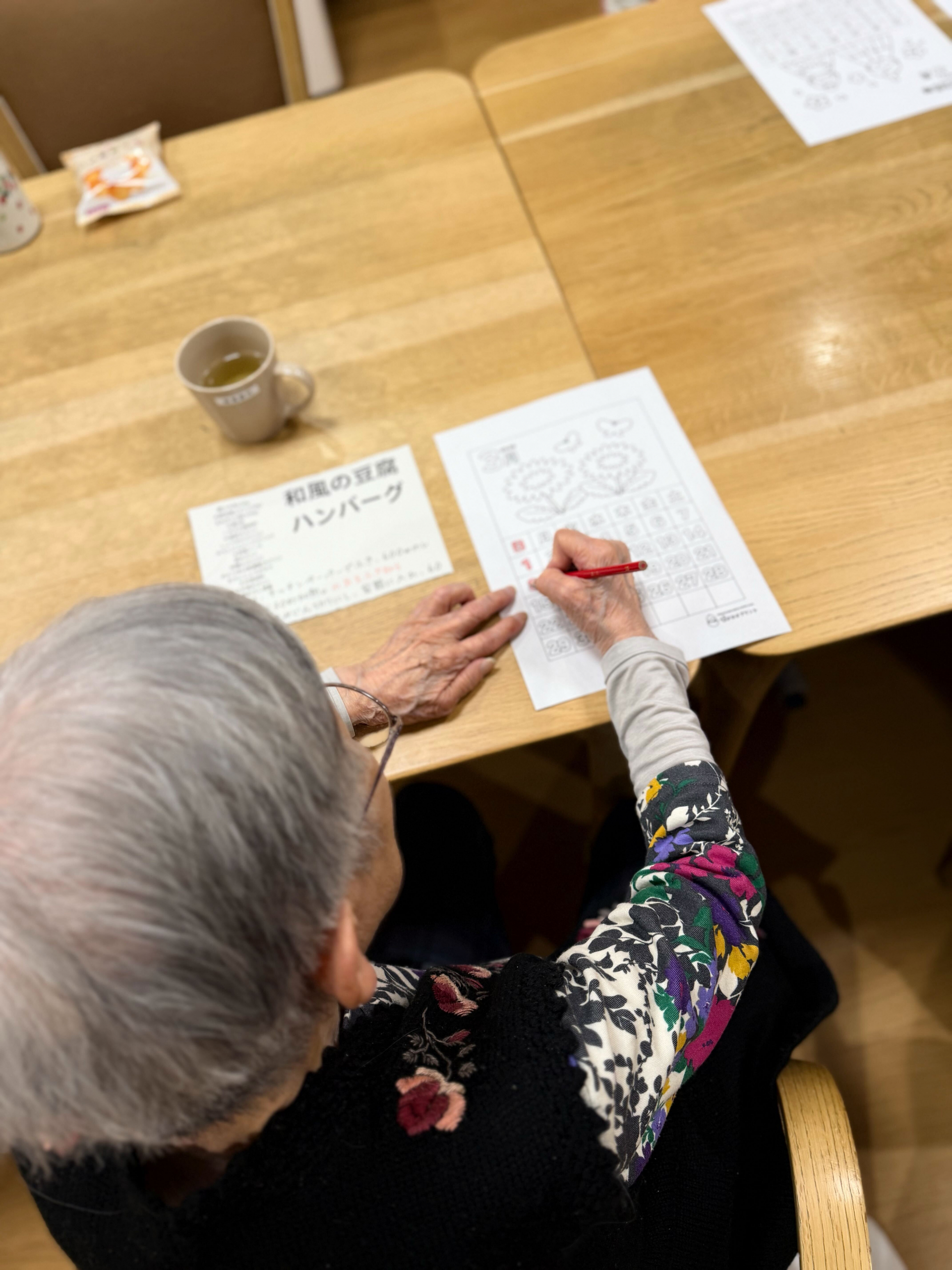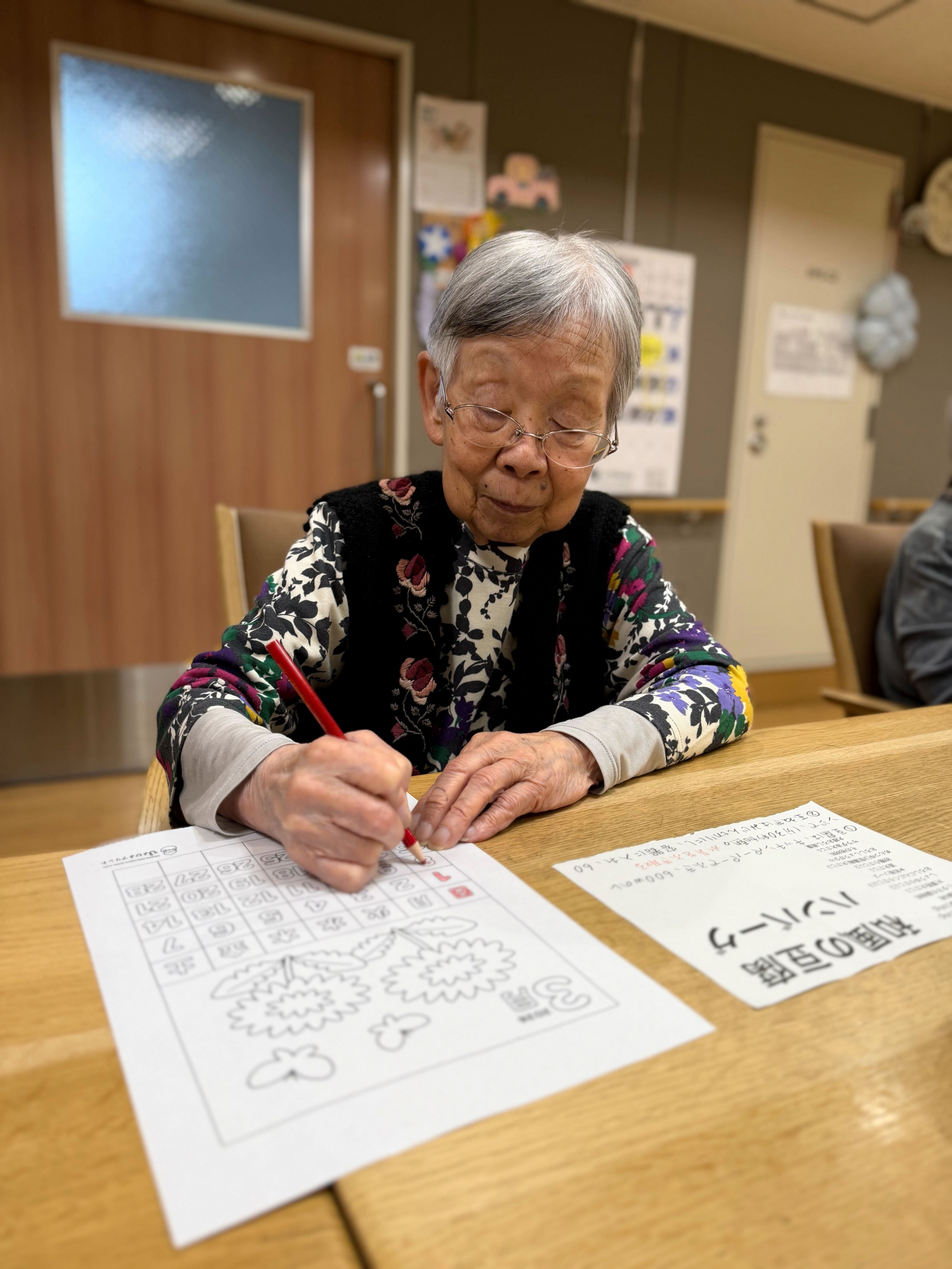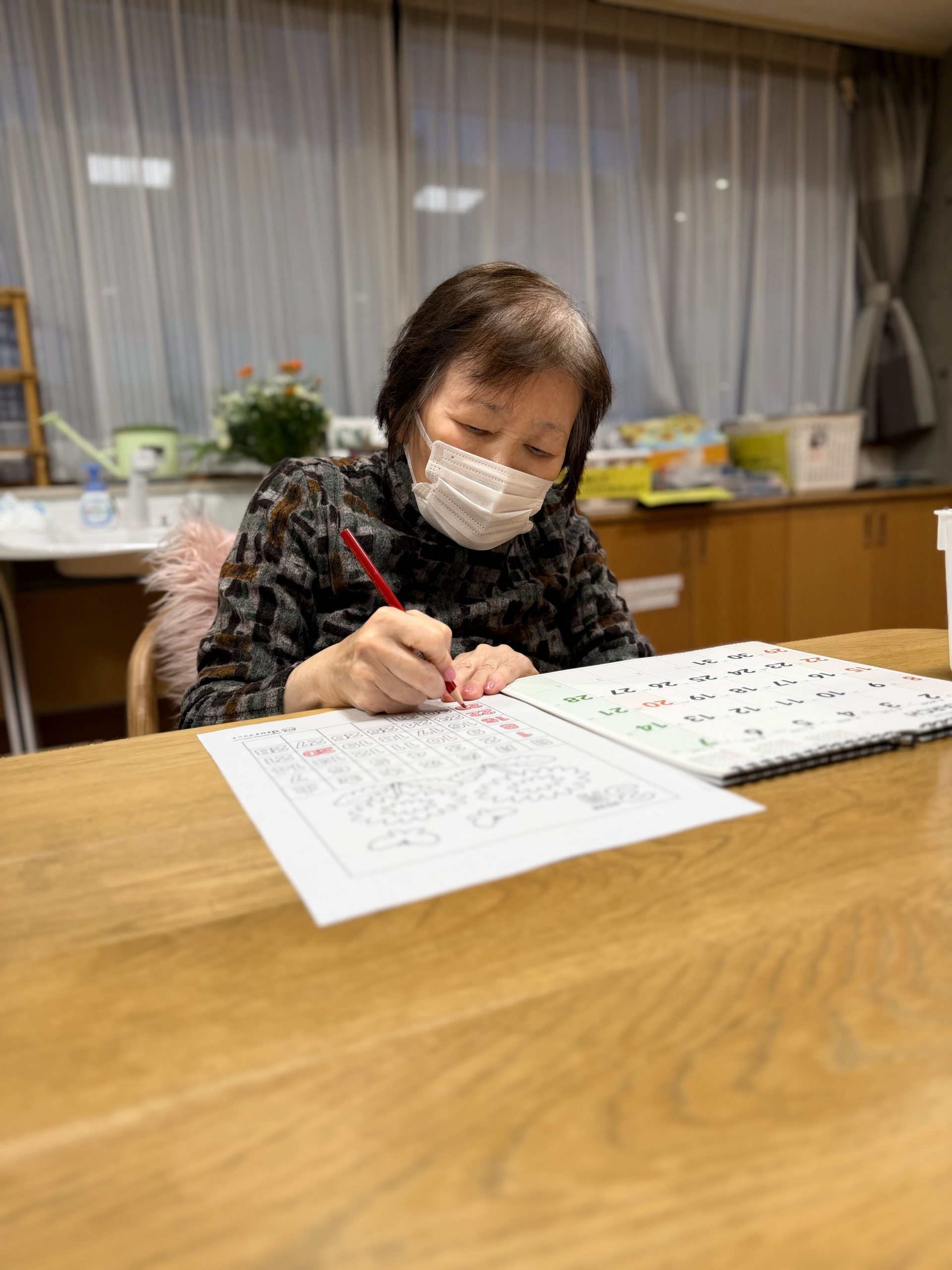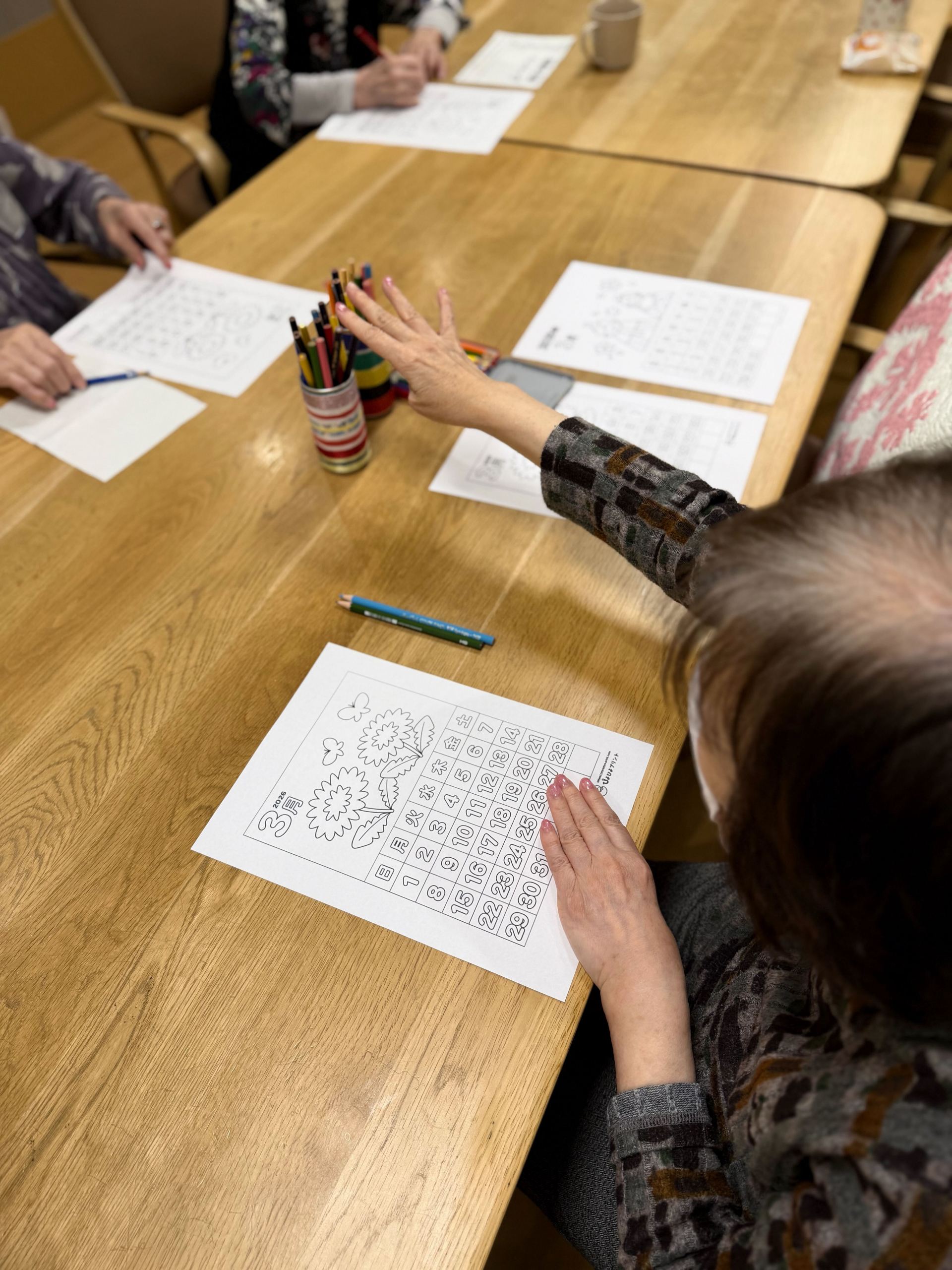 今月のレクリエーションでは、3月のカレンダーのぬり絵を行いました。いくつかのイラストの中から、お好きなデザインを選んでいただいたところ、今月は「お花」と「おひな祭り」のテーマが大人気でした。3月3日はおひな祭りということもあり、季節を感じられる素敵な選択ですね。