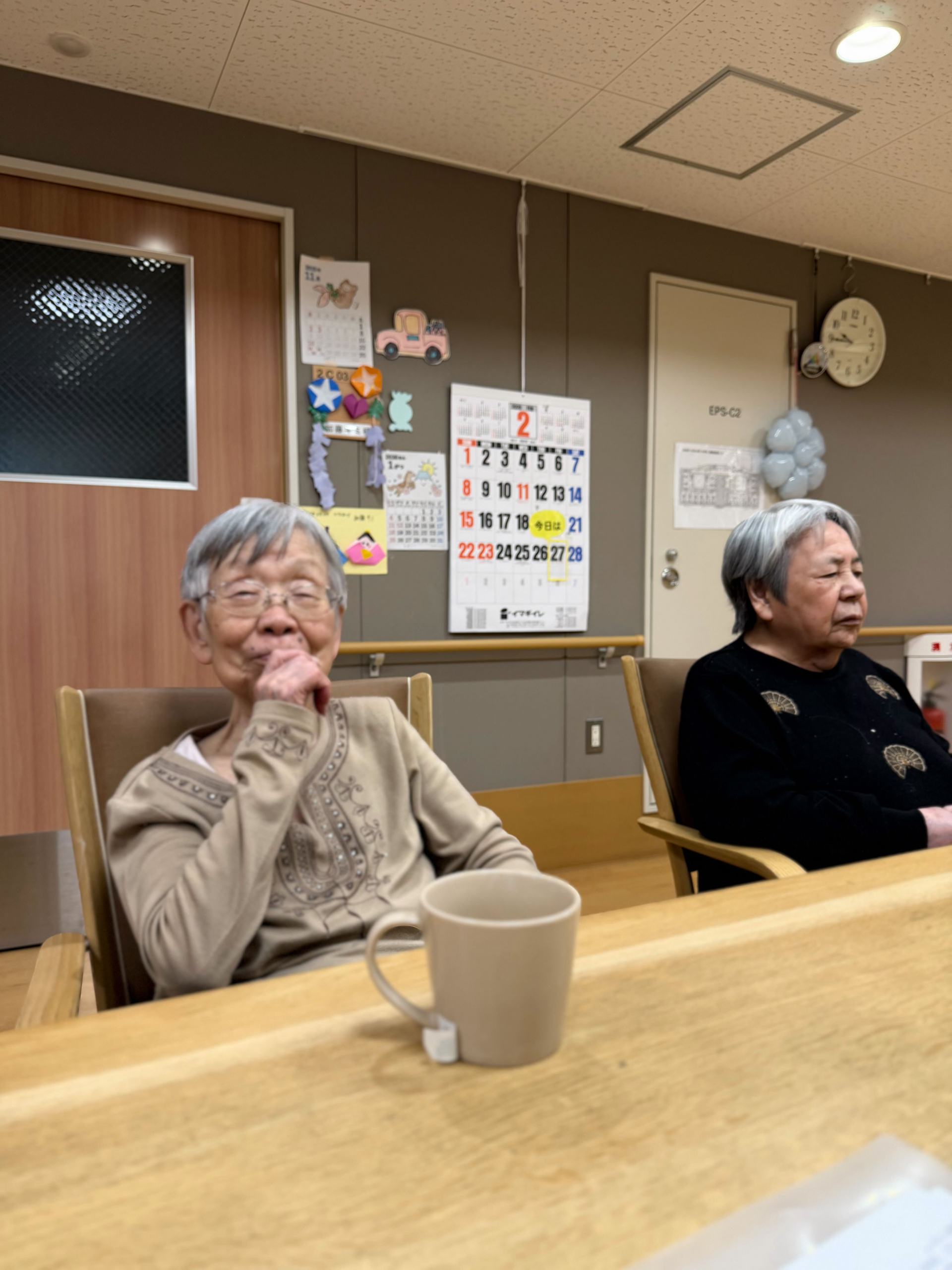 朝の水分補給の時間(すいぶんタイム)、温かいお茶を片手に、ミニカラオケ大会がスタート。歌詞を覚えている人も、うろ覚えの人も、関係ありません。音楽に合わせて声を重ね、笑い合いながら、心がひとつになっていきました。