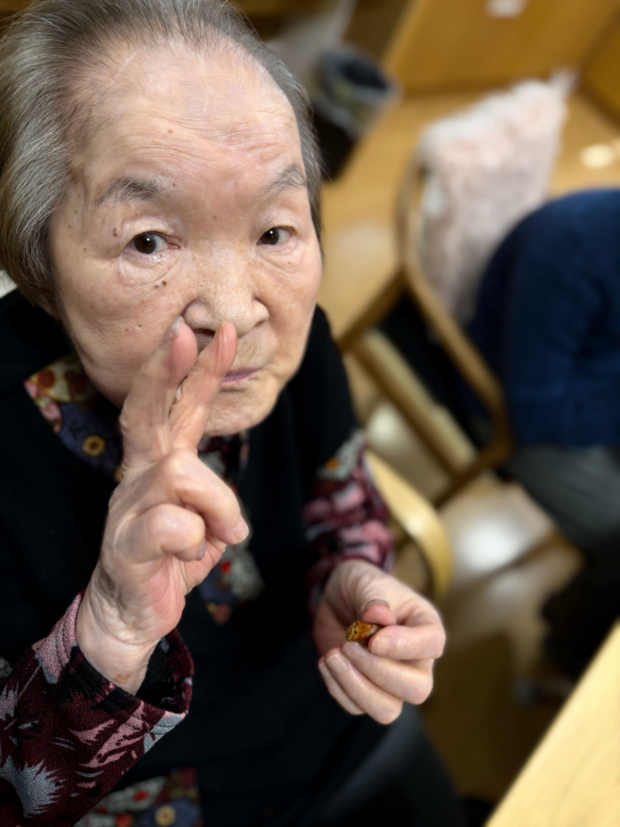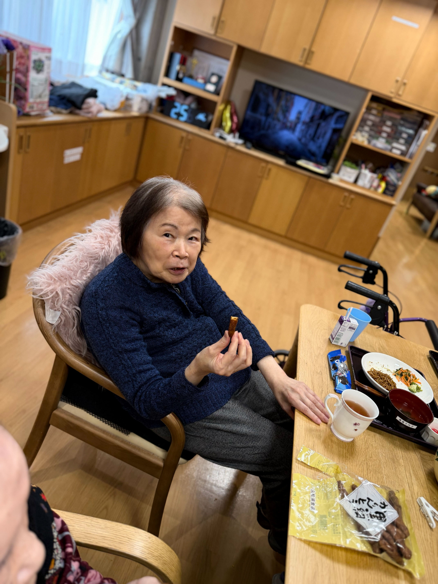 午後のやわらかな日差しが差し込む中、つばめの里では心温まるひとときが広がっていました。その中心にいたのは、いつも優しく微笑む利用者の一人、イ様です。この日、イ様は「みんなにぜひ食べてもらいたいものがあるの」と、静岡から取り寄せたおせんべいや、昔懐かしいかりんとう、そして甘くてほっとするお菓子をたくさん用意してくださいました。