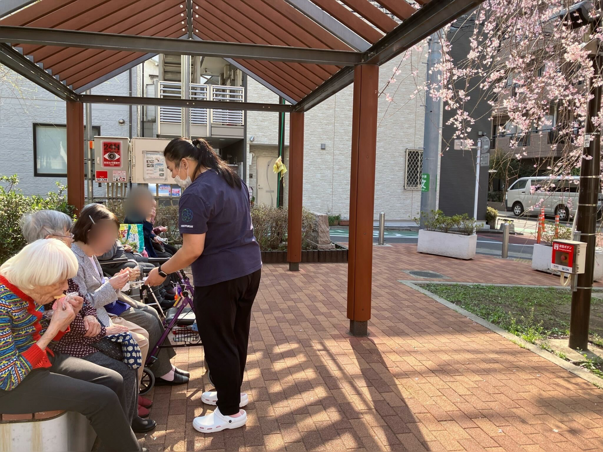 桜の下では、温かいお茶とともに、おはぎを召し上がっていただきました。「やっぱり外で食べると違うね」「春だねえ」といった言葉とともに、皆さまの表情も自然とやわらぎます。お一人おひとりのペースで、ゆっくりと味わうその姿がとても印象的でした。