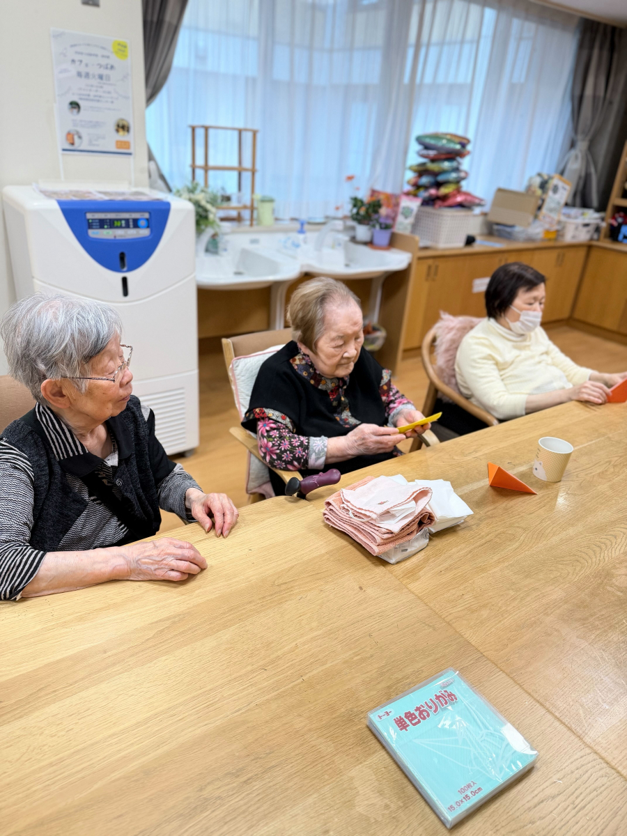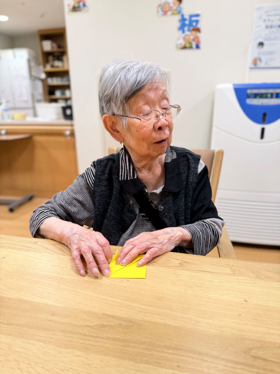 つばめの里のグループホームでは、レクリエーションの時間に、折り紙を使ってこどもの日のかぶと作りを楽しみました。