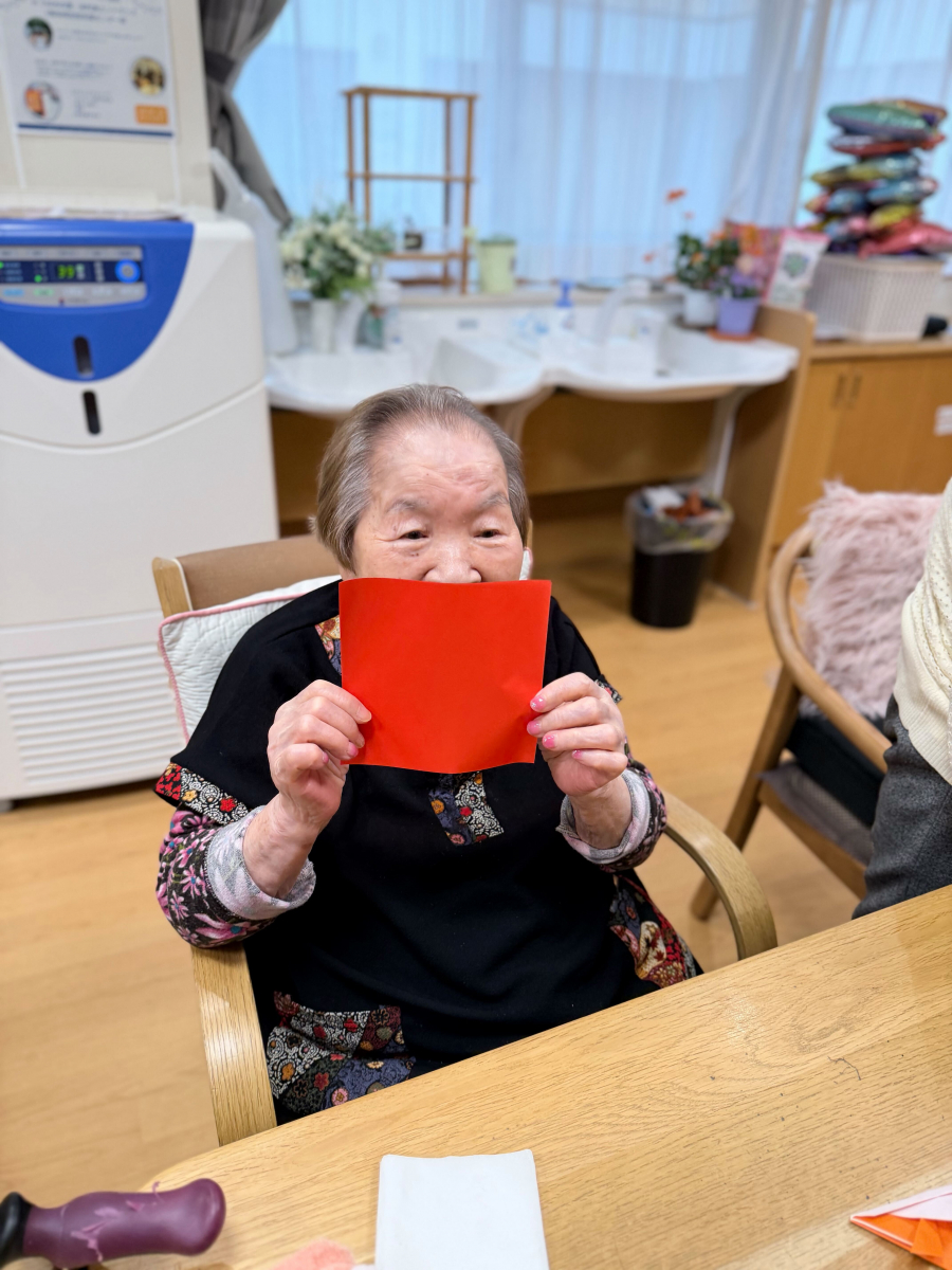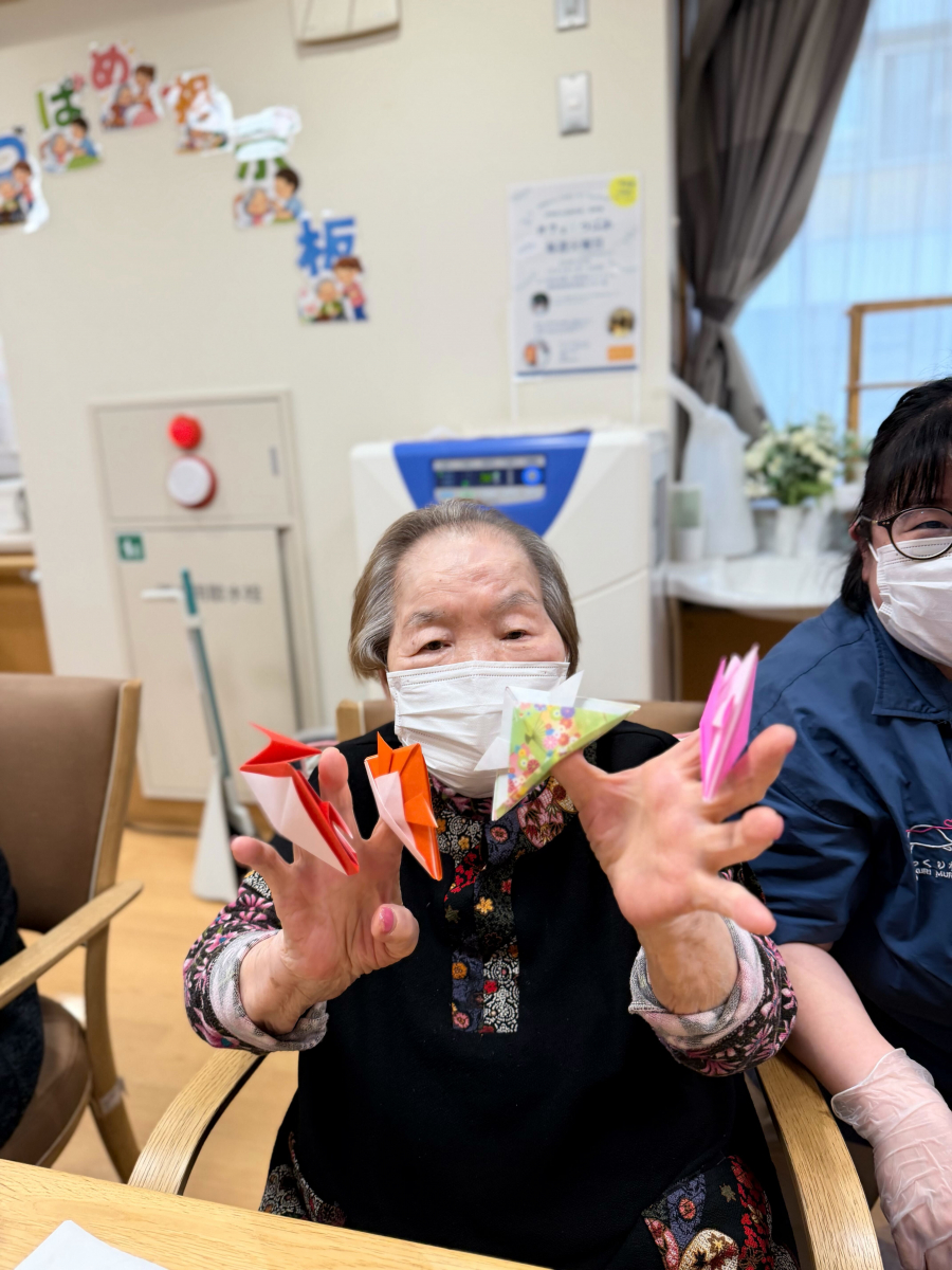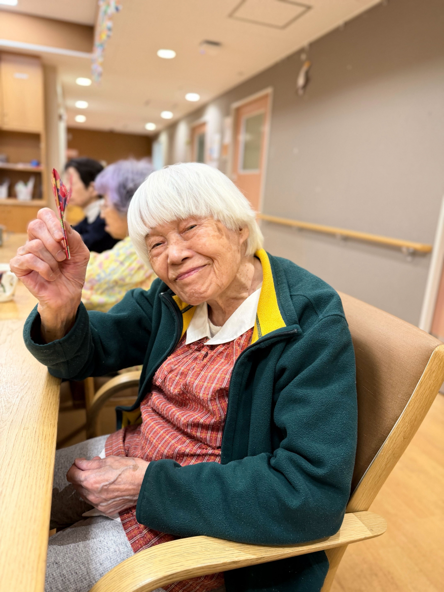 At the elderly group home Tsubame no Sato, we spent a wonderful and lively recreation time making kabuto (samurai helmets) for Kodomo no Hi using colorful origami paper.