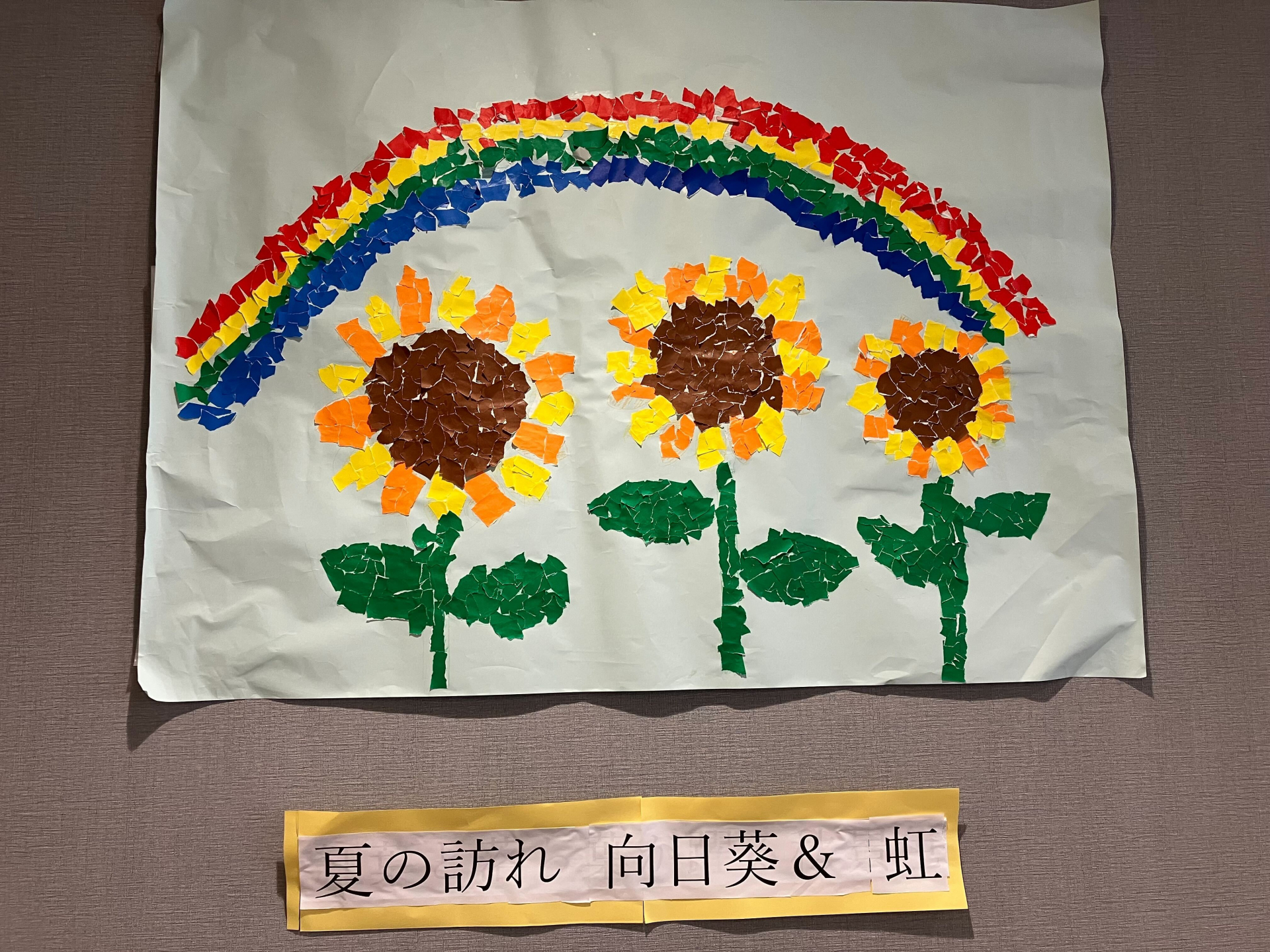 皆さまで仲良く、力を合わせて折り紙をちぎって作ったちぎり絵が完成しました^_^