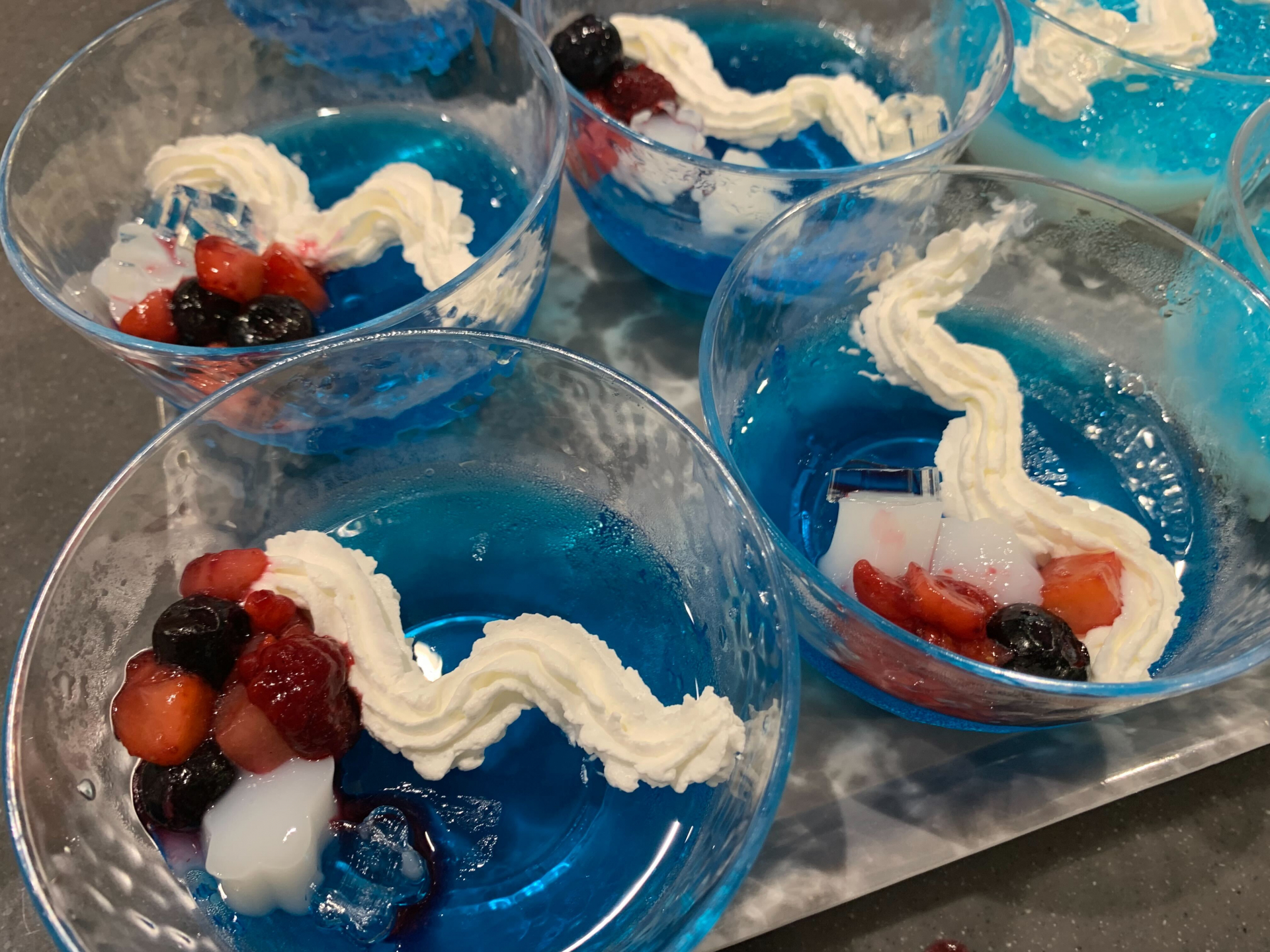 カルピス・ブルーハワイ・ポカリの3種類のゼリーを用意し、夏の暑さを吹き飛ばせるように涼しげな一品をご様子しました!