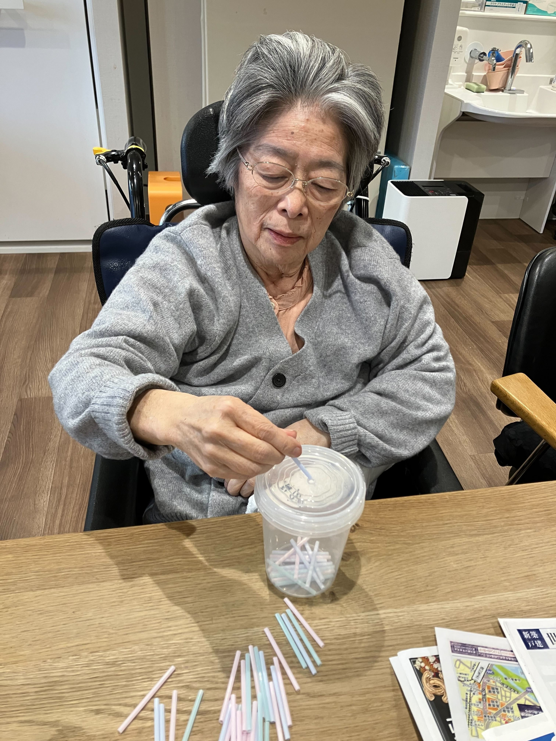 おやつ頂いた後にE様とコップの穴にストロー通すレクリエーションをやりました。q(≧▽≦q)