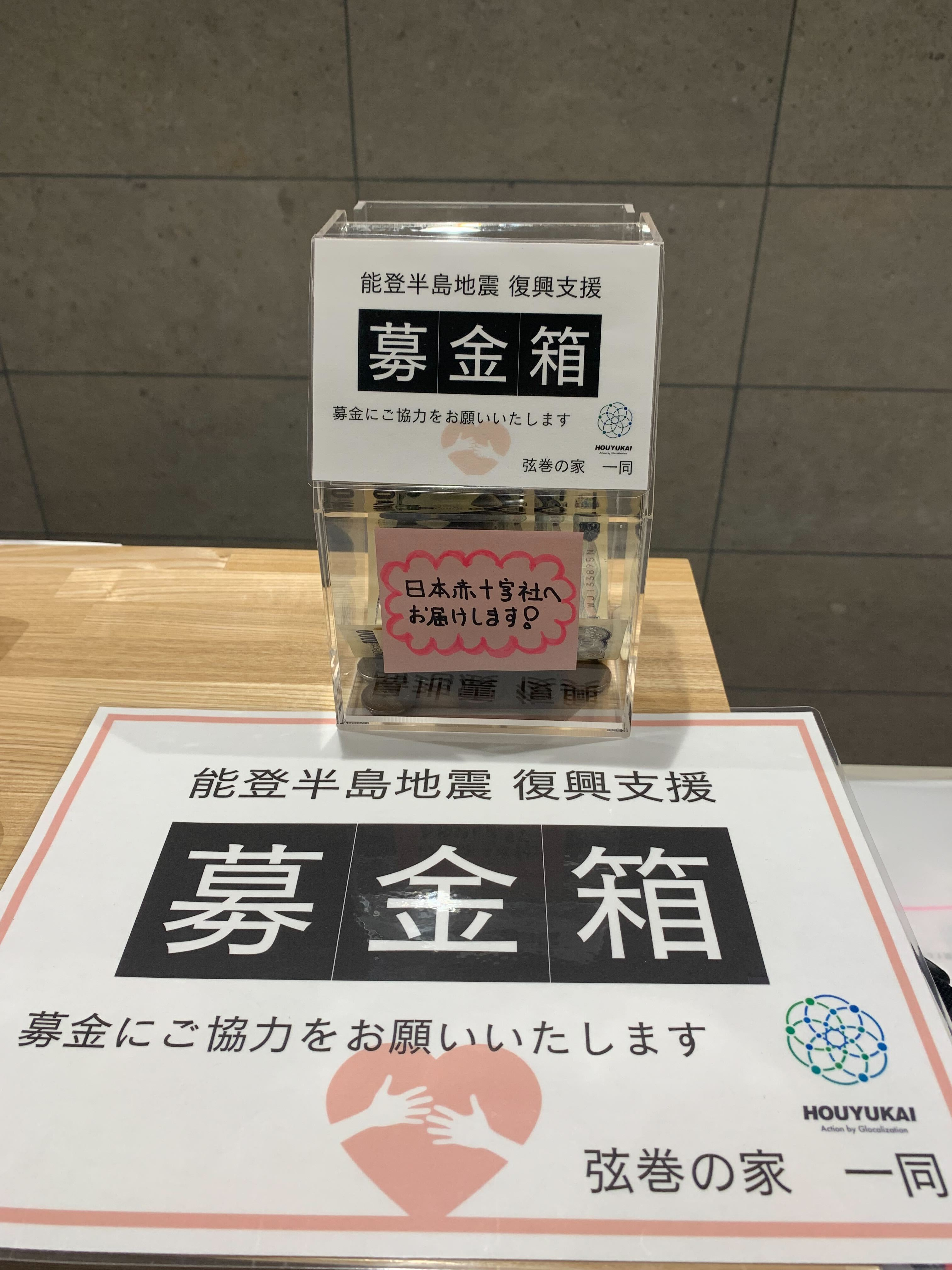 優っくり村弦巻看多機こと優っくり看護小規模多機能介護弦巻がございます特別養護老人ホーム弦巻の家では、この度の石川県能登半島地震の復興支援のため募金箱を設置いたしました。