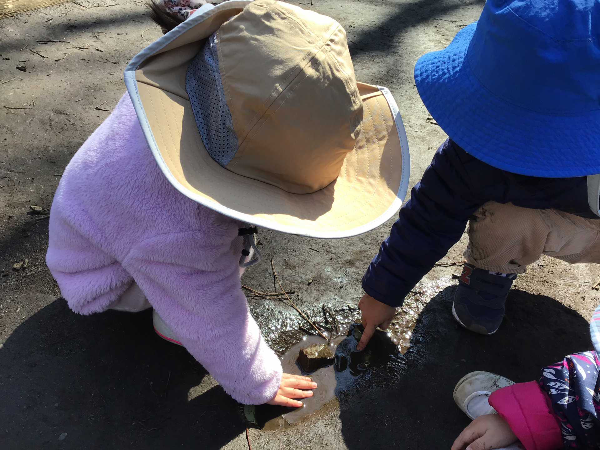 昨日の雨で地面がぐちゃぐちゃかなと思いましたが、そんなこともなく、小さな水たまりがいくつかある程度。しばらく遊んでいると子ども達が水たまりに気が付きました。きっと大人ならなにも思わないような小さな小さな水たまり。でも子ども達は違います。それを見つけると枝で突っついてみたり、かき混ぜてみたり..石や葉っぱを入れる子もいました。