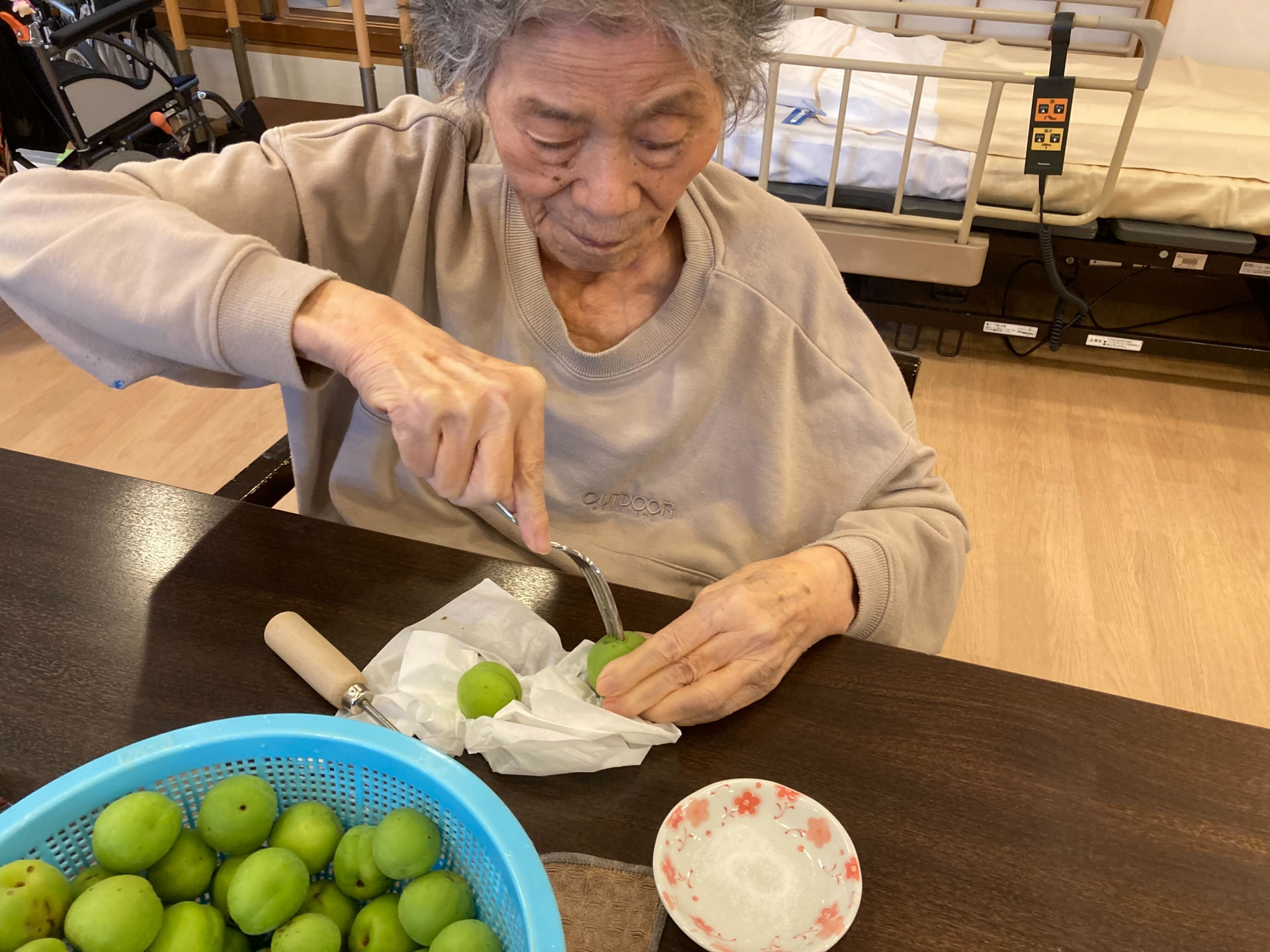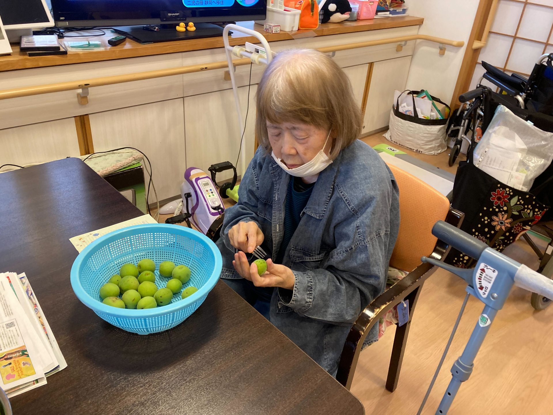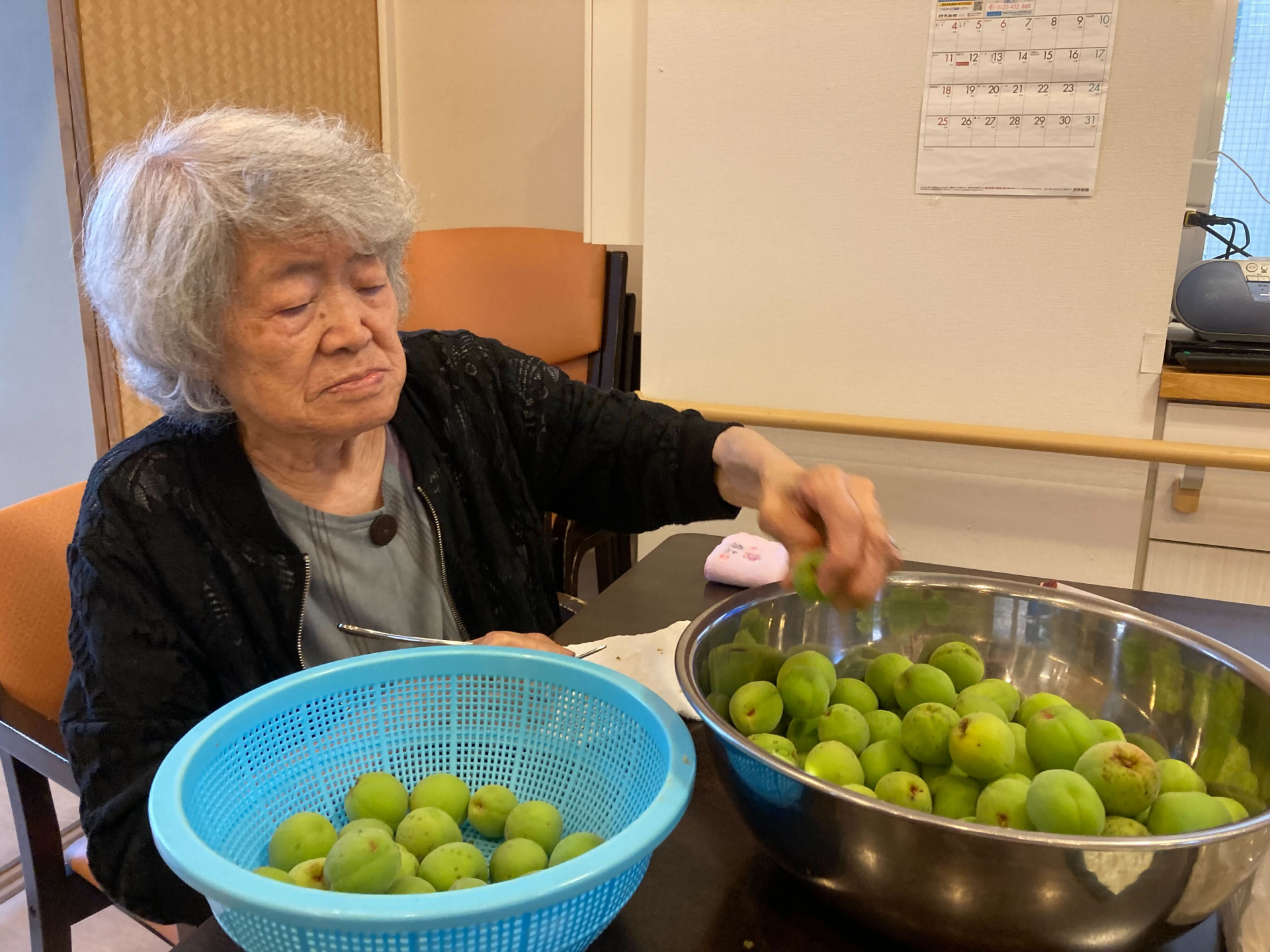 たくさんの青梅からヘタを取り除くのも