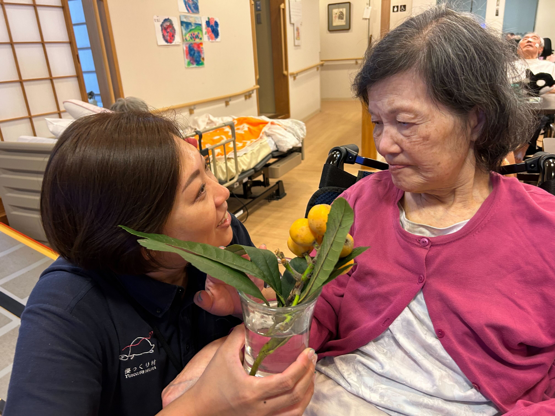 送迎時、ご家族から庭のビワを枝付きでいただきました。