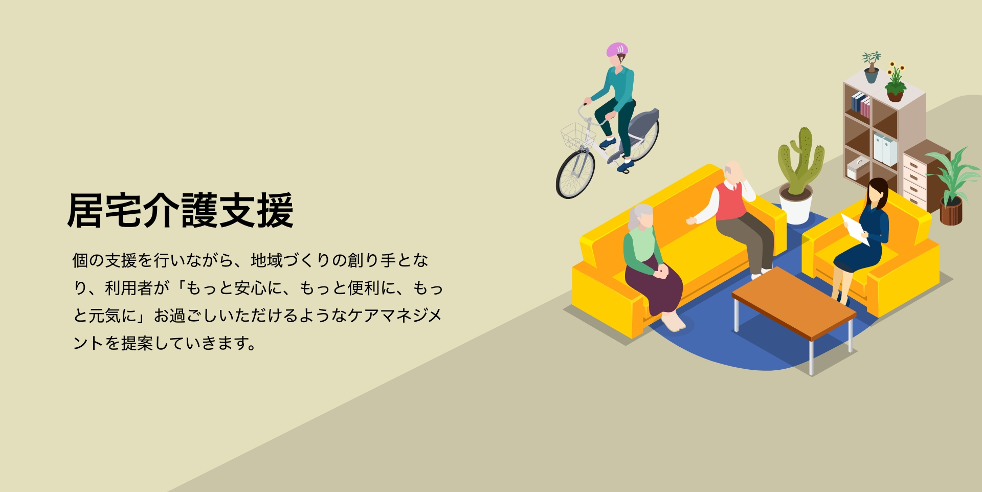 個の支援を行いながら、地域づくりの創り手となり、利用者が「もっと安心に、もっと便利に、もっと元気に」お過ごしいただけるようなケアマネジメントを提案していきます。