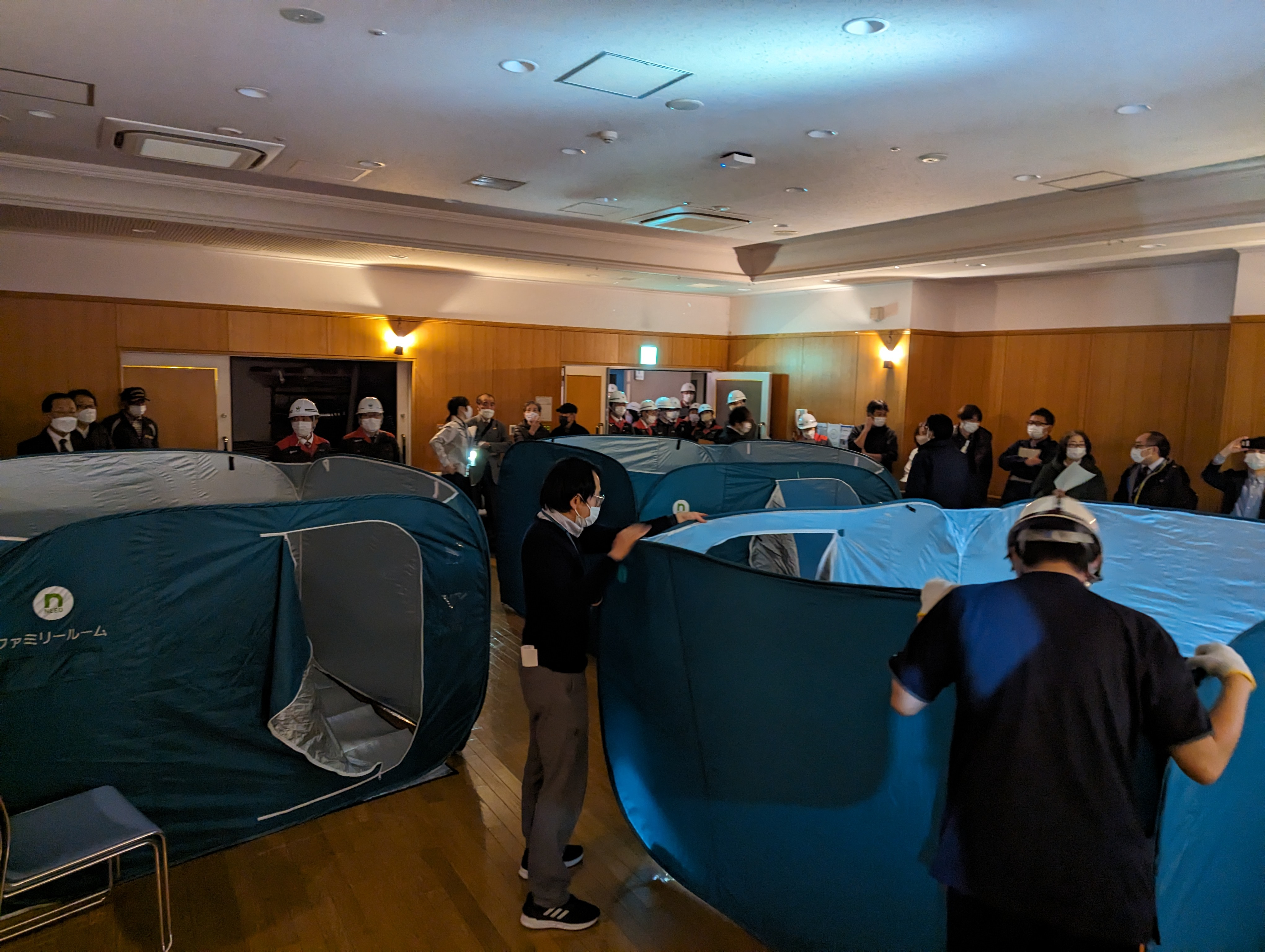 パーティションやエアベッドを組み立て、避難スペースを作っていきます。先日予行演習も行っていたので、スムーズに訓練が行えました。