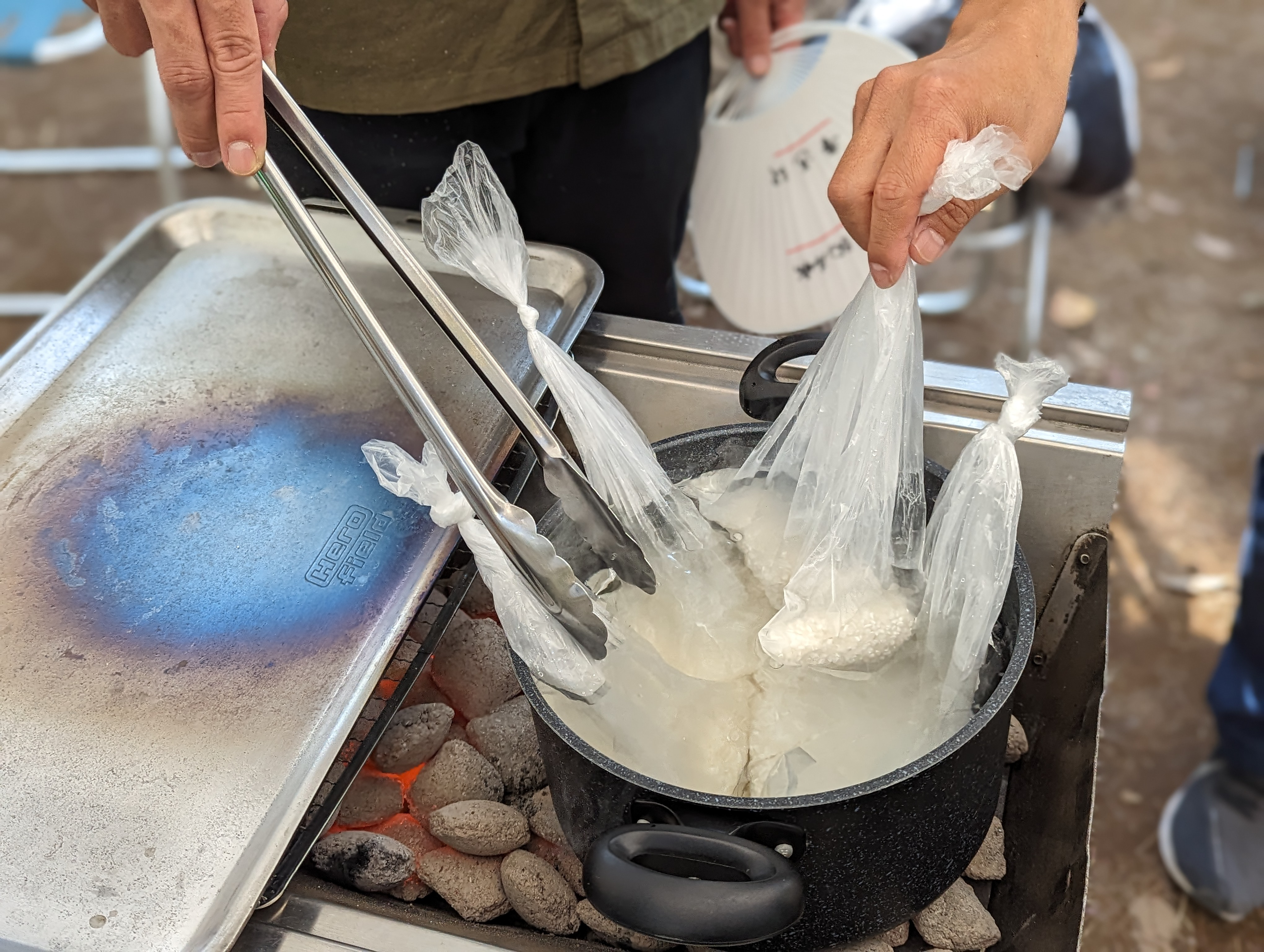 グループに分かれ、ごはん、カレー、 焼きそばを1人分ずつポリ袋に入れて鍋で湯煎しました。