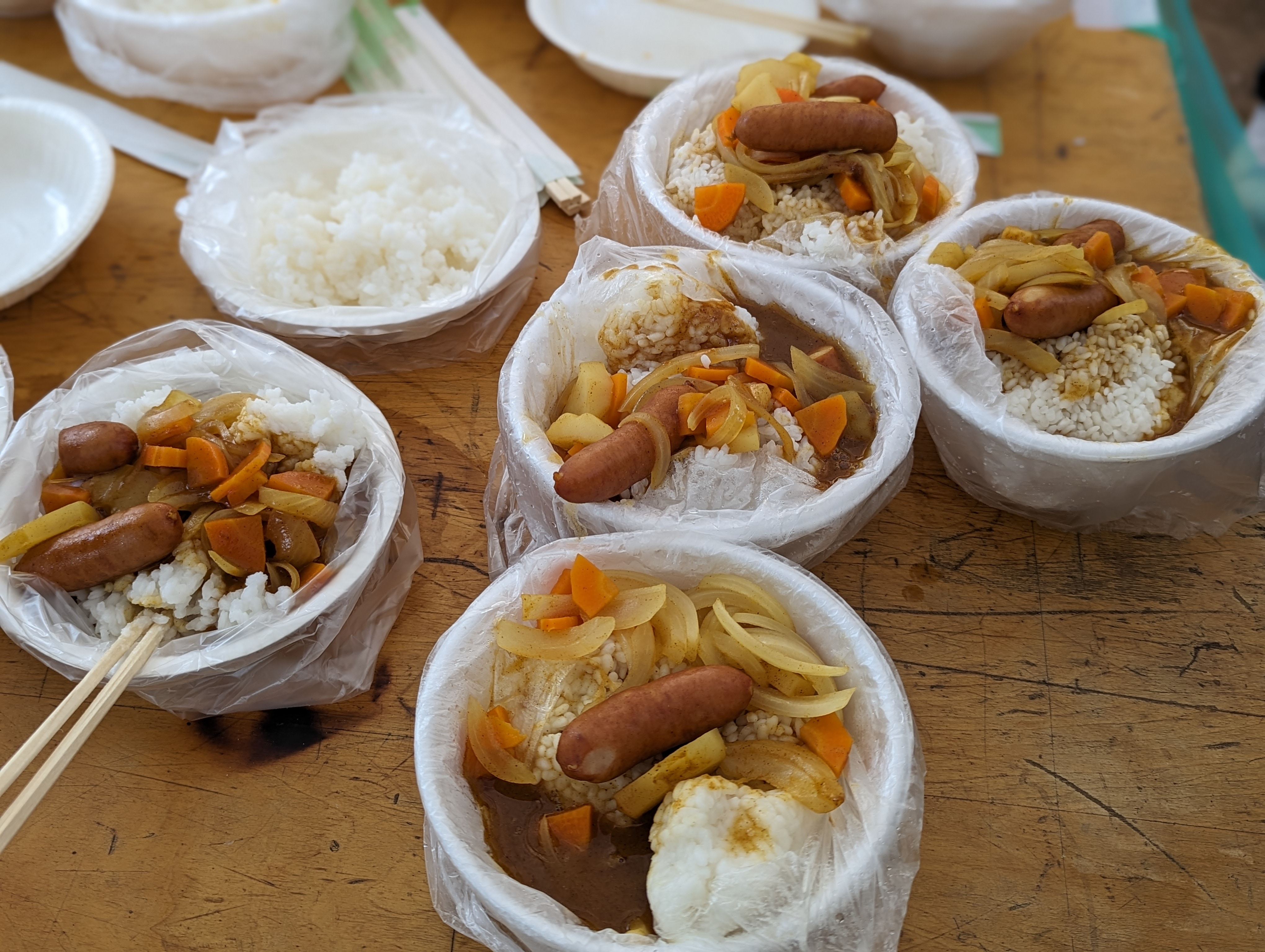 カップにご飯をポリ袋ごと入れてそこにカレーをかけていただき ました。
