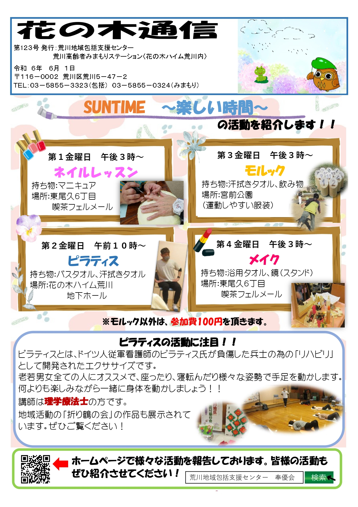 2024.06.03 活動報告 【荒川包括】花の木通信123号発行しました Tweet シェアする 花の木通信123号を発行しました。 今回は地域パートナーの会「SUNTIME」の紹介を載せさせていただきました。 是非ご覧ください。 #花の木通信 前の記事 2024.06.04 活動報告 【荒川包括】アグぽてファームで玉ねぎを収穫しました 次の記事 2024.05.31 活動報告 【荒川包括】ケアマネさんへのお知らせ 一覧へ戻る