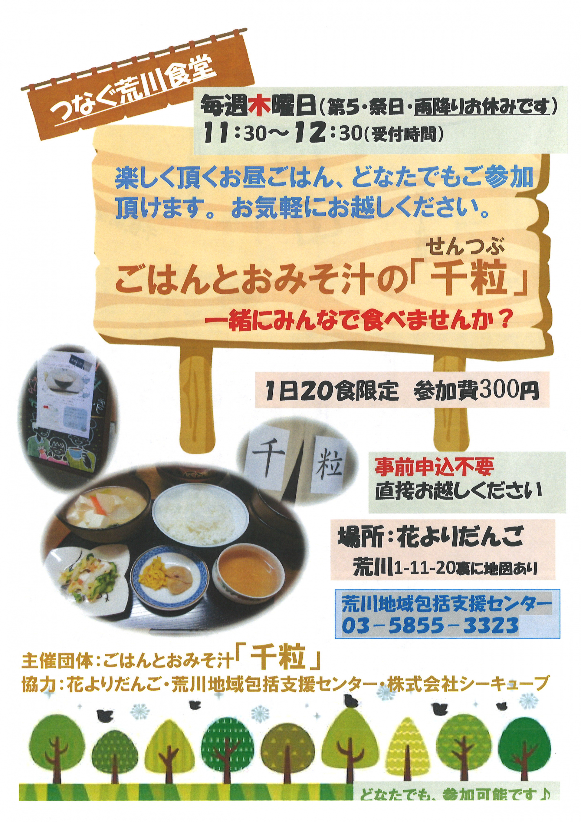 先日、地域パートナーの会として活動する、つなぐ荒川食堂「千粒」に伺いました。