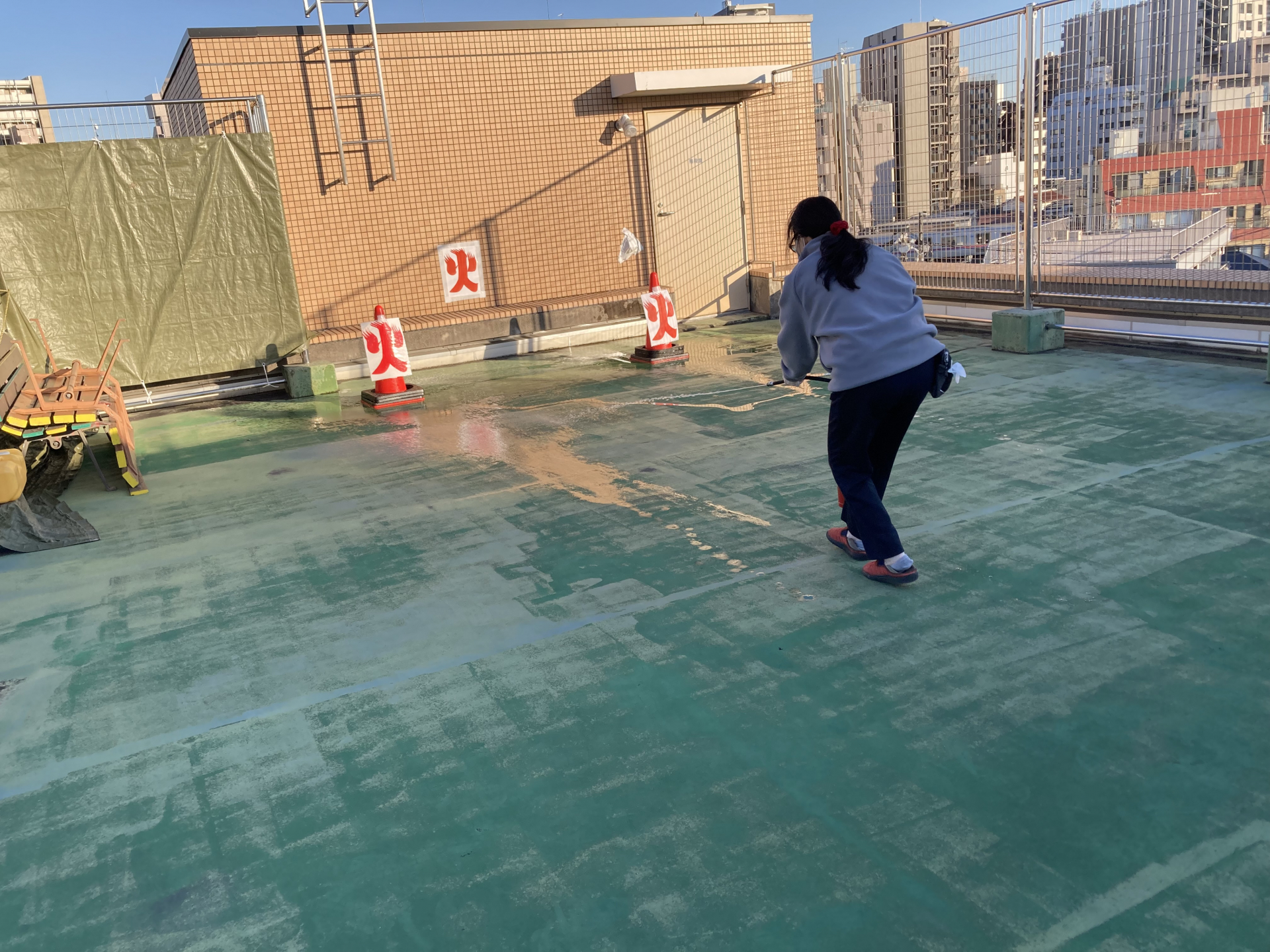 訓練では、消火栓の発信器(非常ベル)を実際に押したり、消火器を使用して初期消火の方法を学びました。