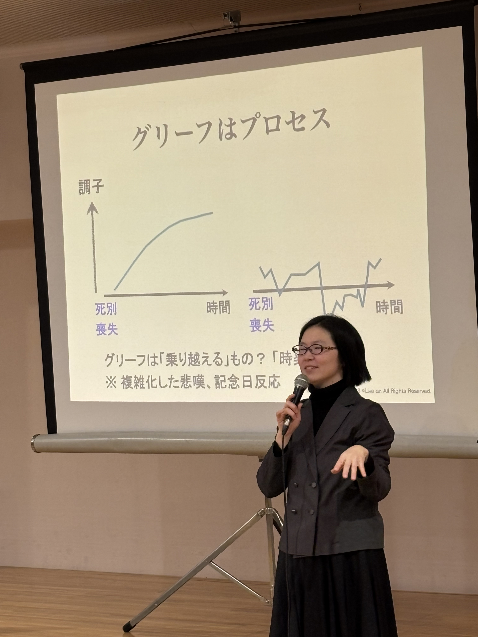 大切な人やものを失い、グリーフケアを必要としている人へのサポートが当たり前にある社会を目指し活動している、一般社団法人リヴオンの代表である尾角光美氏を講師にお迎えし、2月26日(火)グリーフケアについての講演会を開催しました。