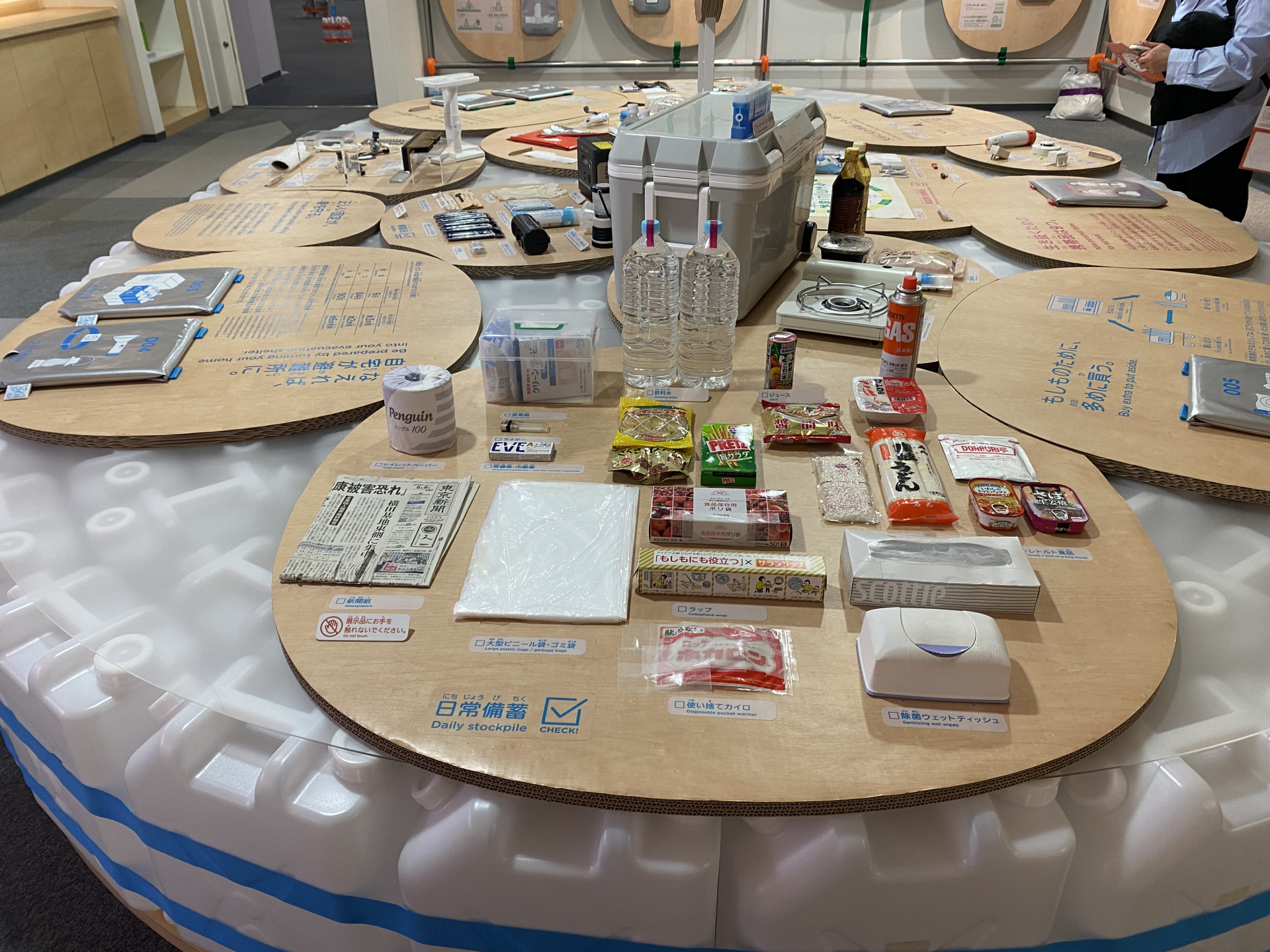 防災学習ゾーンもあり、災害が発生する前に備えるものが展示されていました。