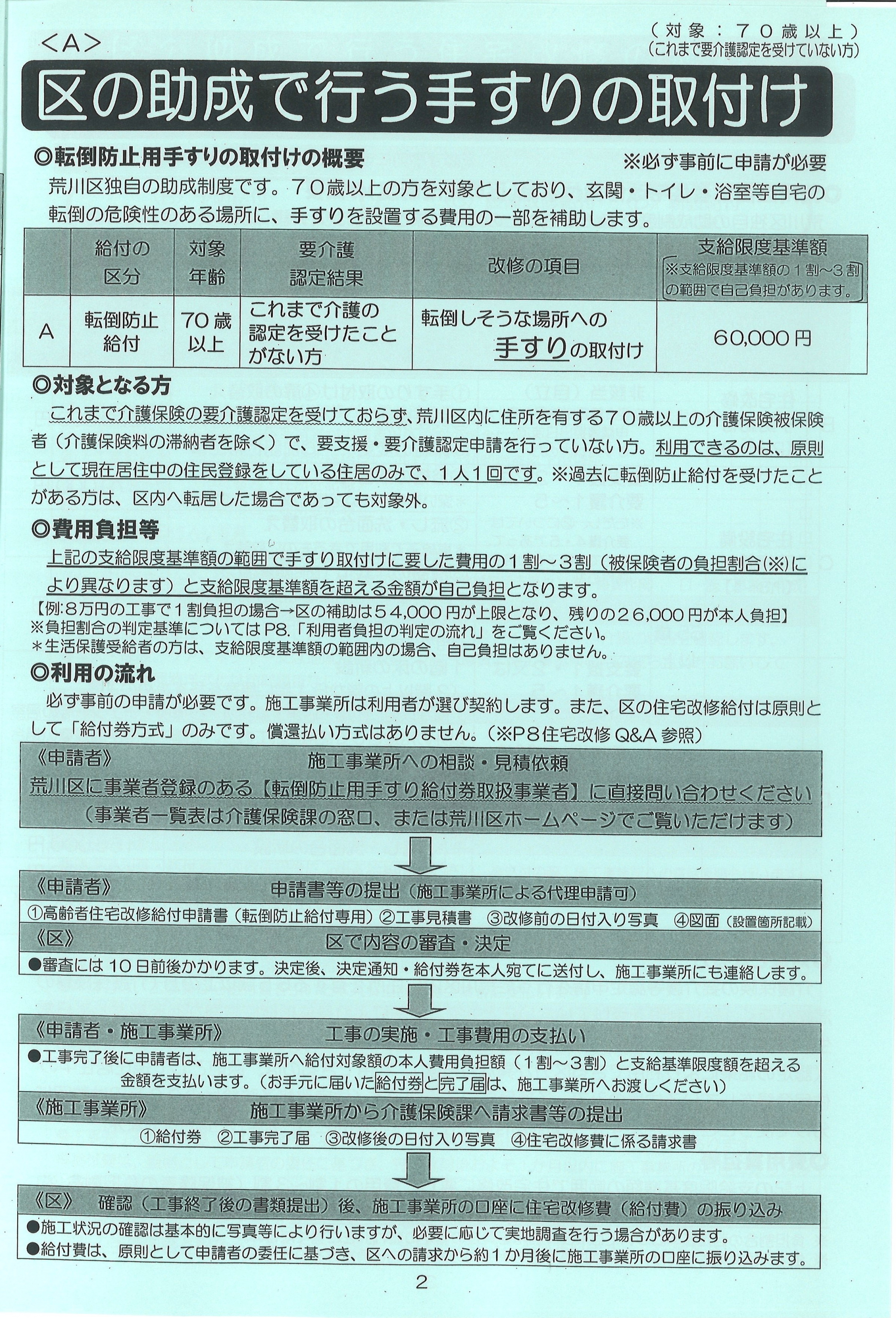 荒川区独自の助成制度で、70歳以上の方を対象に転倒の危険性のある場所(玄関、トイレ、浴室など)に手すりを設置する費用の一部を補助しています。