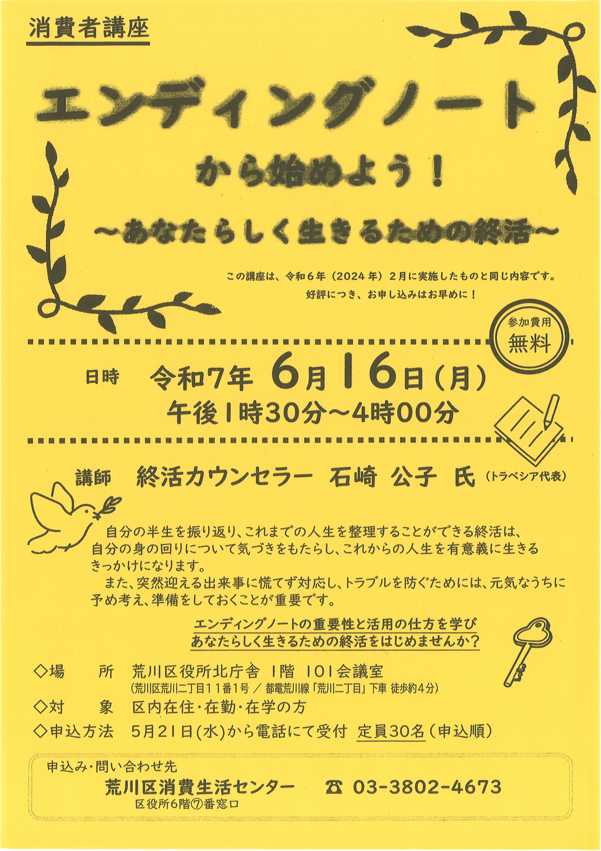 荒川区の消費生活センターでは消費者講座として「エンディングノートから始めよう!~あなたらしく生きるための終活~」を開催します。
