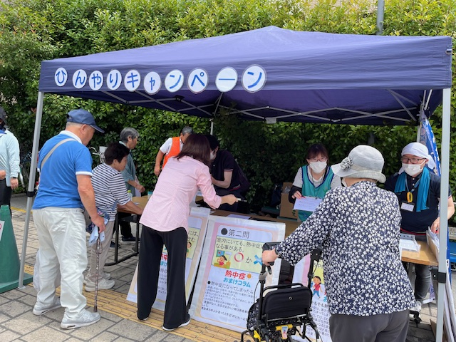 簡単な熱中症のクイズをに答えてもらい、熱中症予防グッズのプレゼントと地域包括支援センター、みまもりステーションの周知を行いました。