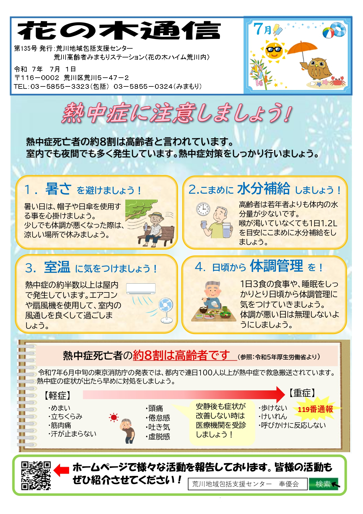 花の木通信135号は、熱中症予防をテーマとして作成しました。