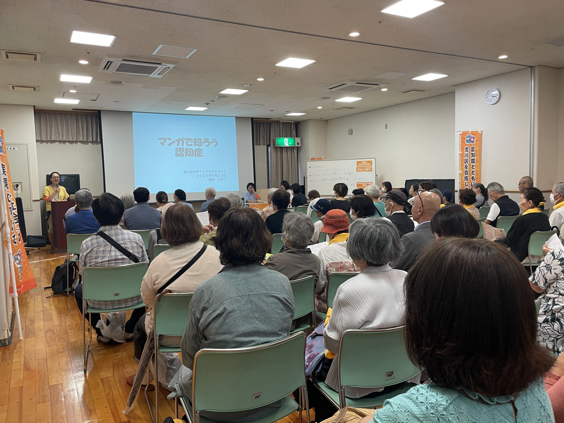 トークショーでは、実際に認知症の家族の介護体験を漫画にした、荒川区内にお住まいの漫画家のエピソードが司会と共に紹介され、認知症の介護の秘訣をユーモアたっぷりにお話頂き、会場からも笑い声が絶えないなごやかな時間でした。