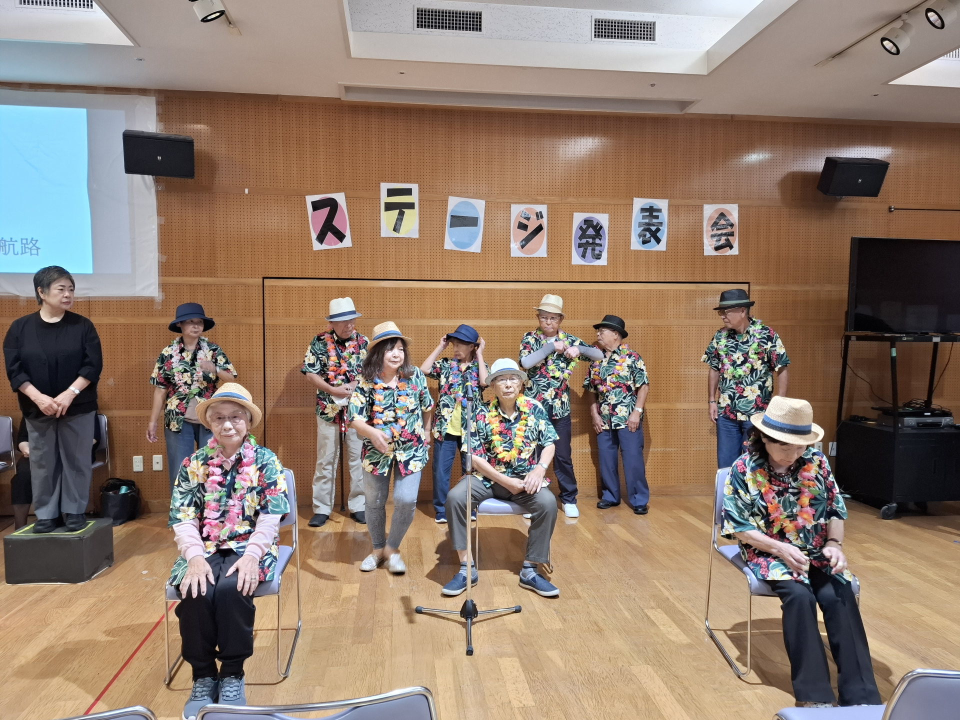 「憧れのハワイ航路」を踊り付きで、アロハシャツに麦わら帽子、レイを掛けて楽しく披露できました。