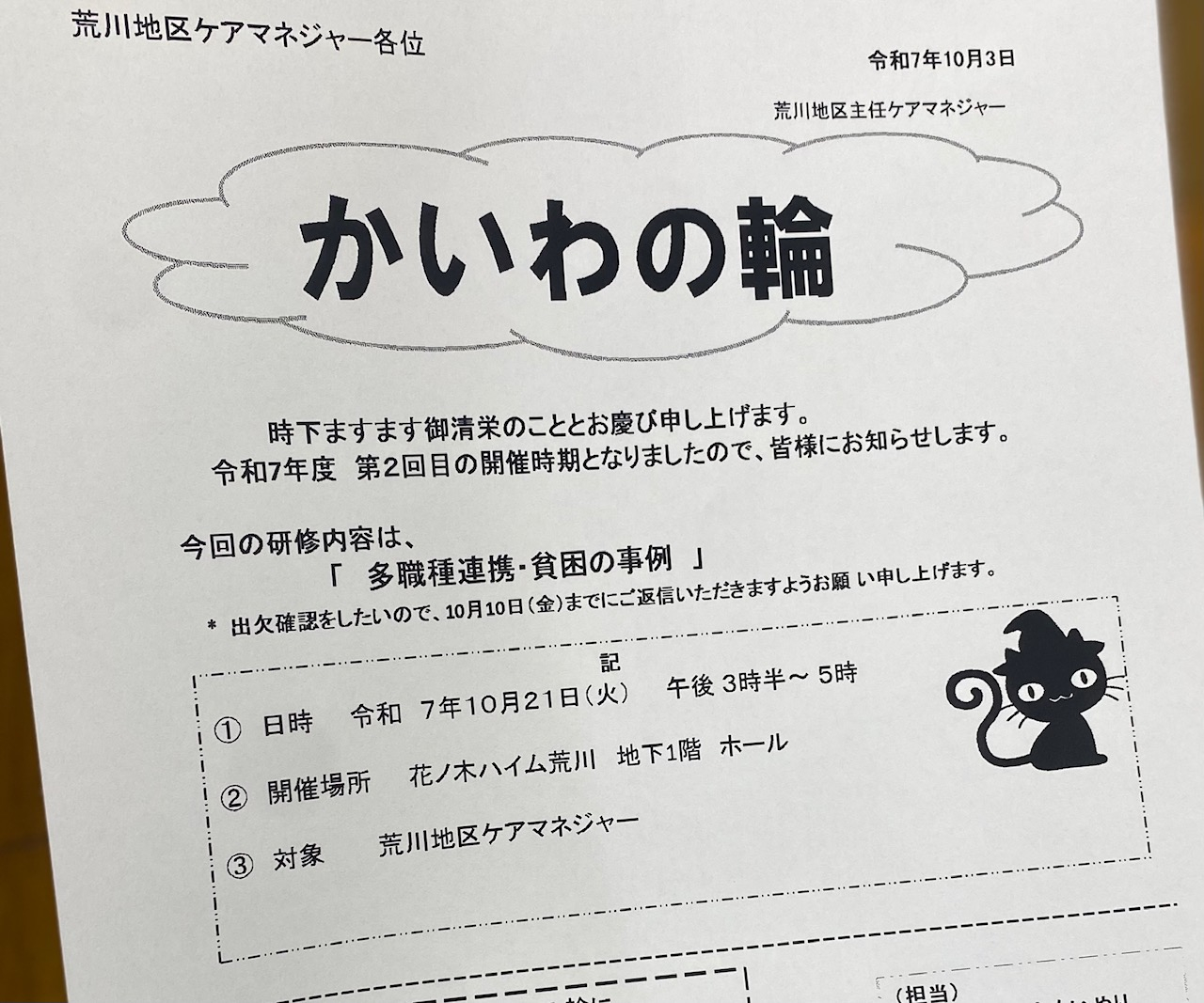 先日、荒川地区のケアマネ会「かいわの輪」が開催されましたので、参加致しました。