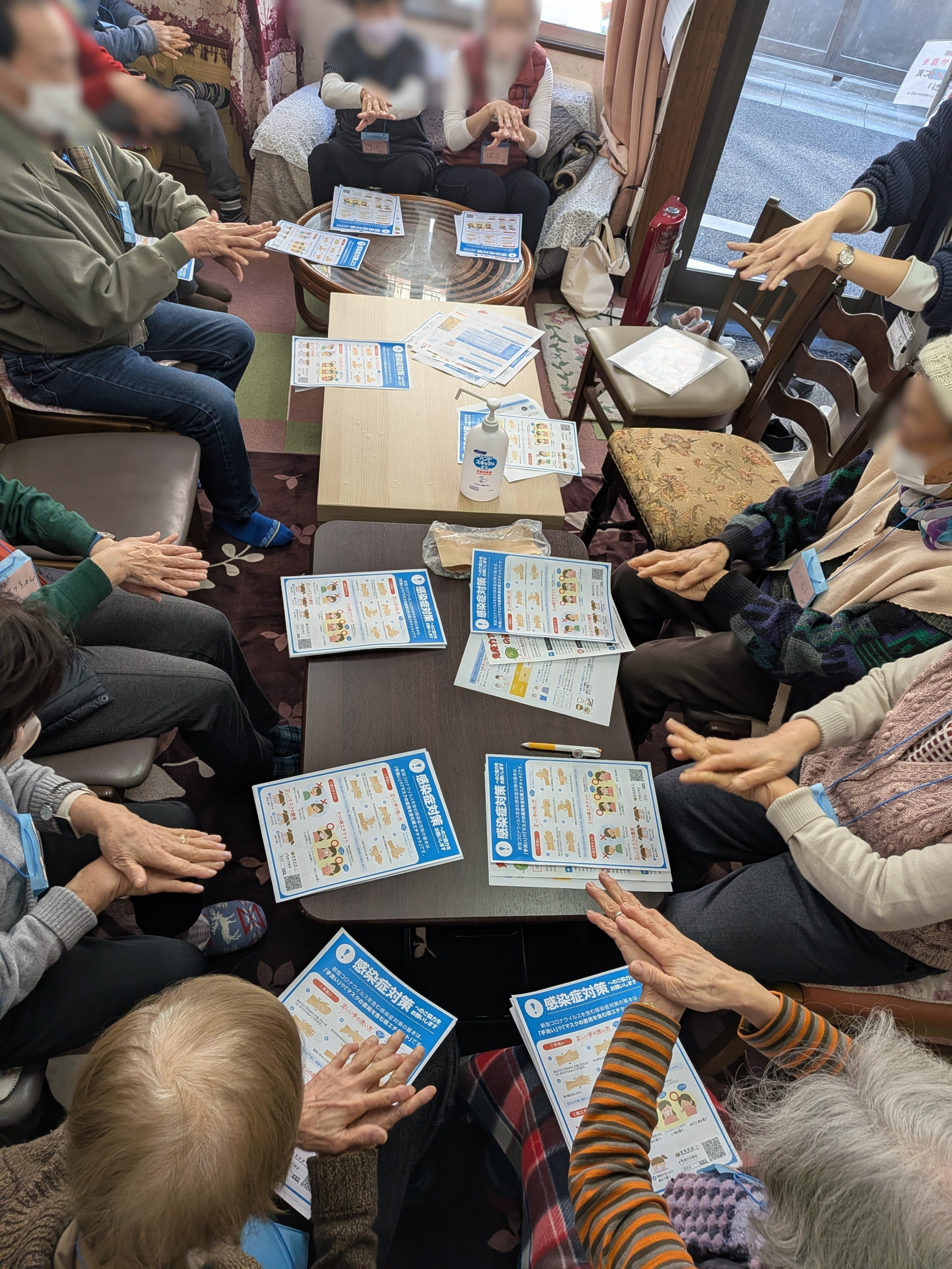感染対策では、正しい手洗いについて皆様と一緒に手を動かしながら実践してみました。