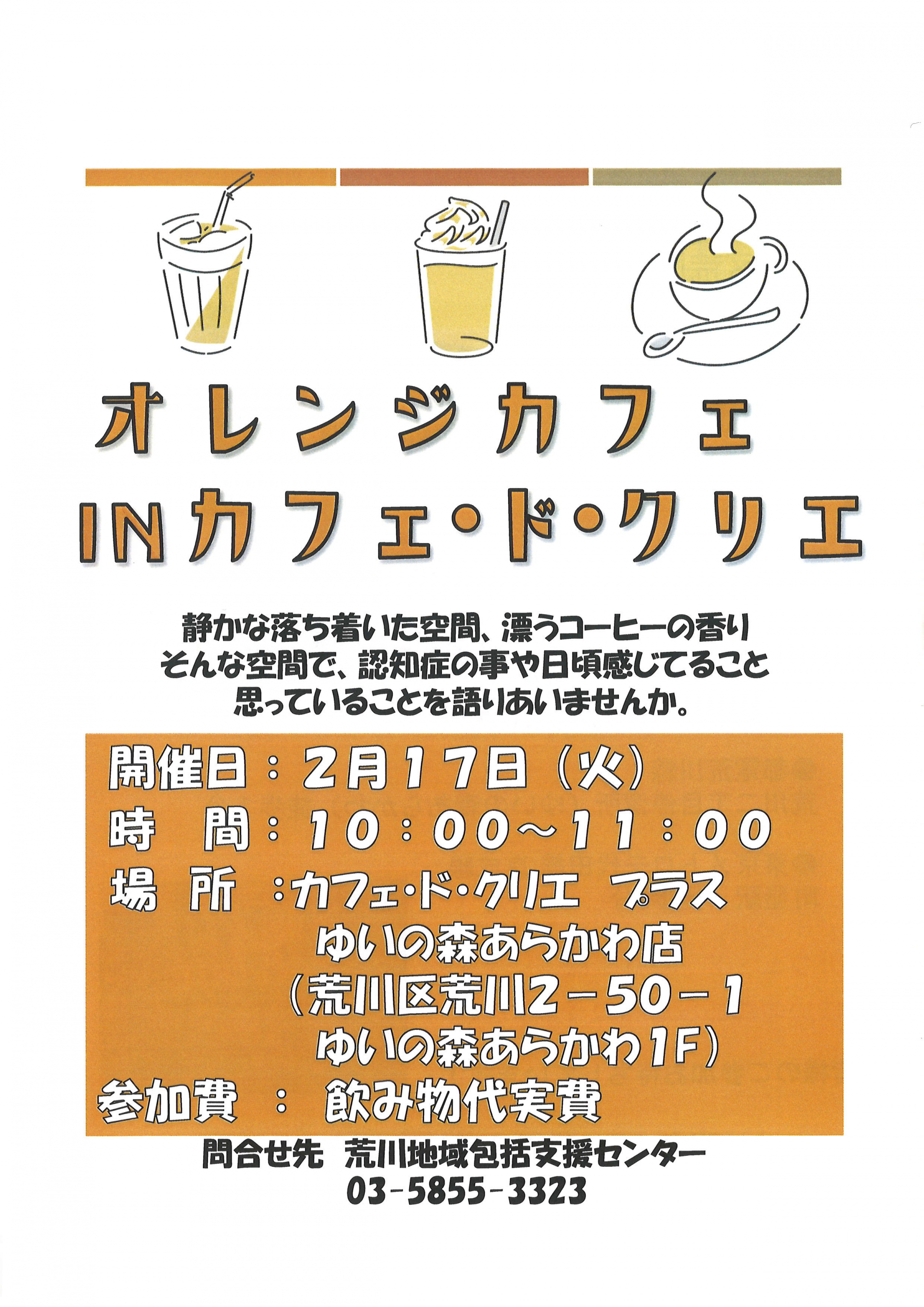2月17日(火)10時~11時に、ゆいの森あらかわ施設内の1階、カフェ・ド・クリエで「オレンジカフェ」を開催致します。