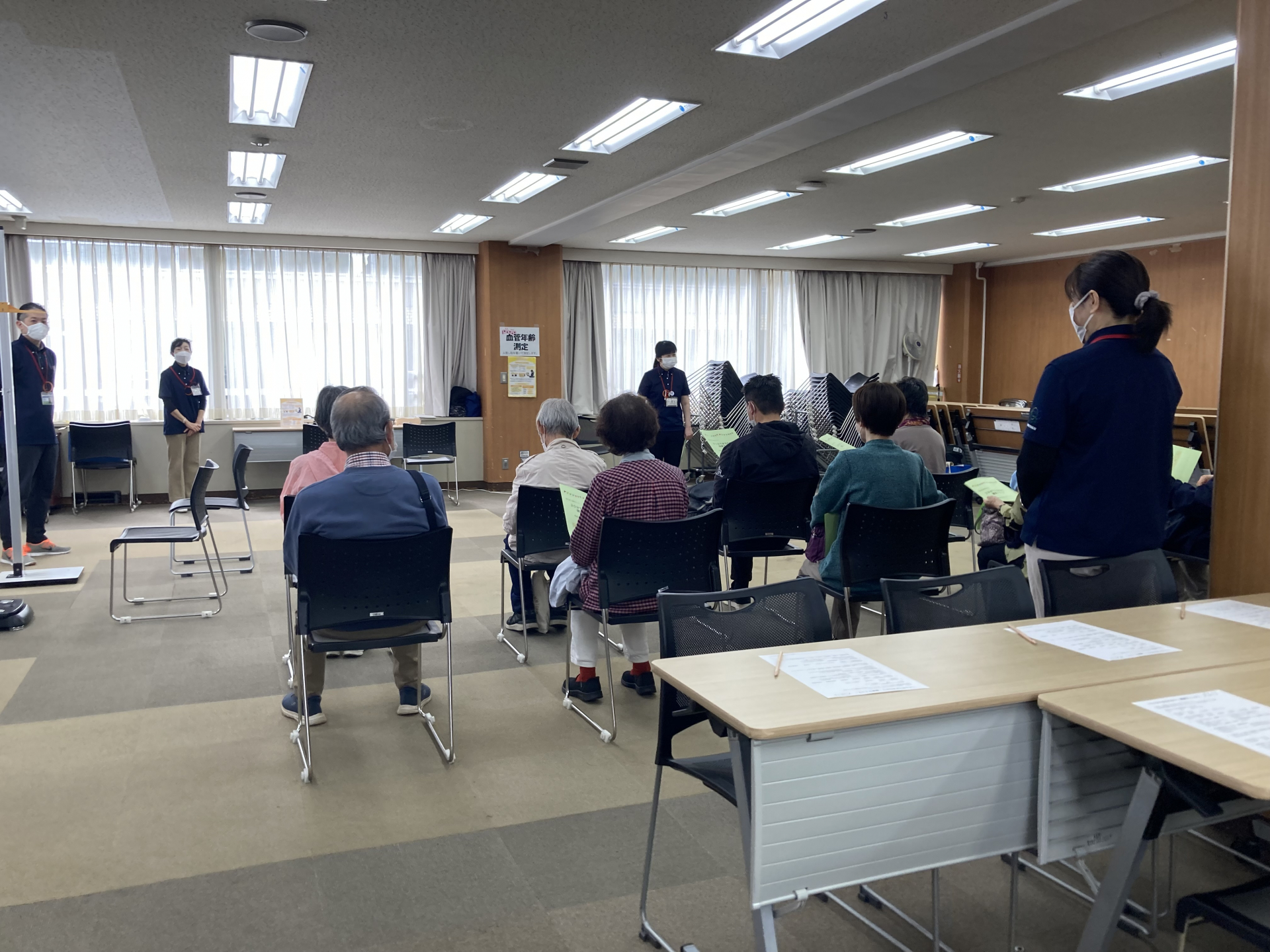 健康測定会では、血管年齢測定、体組成計測定、運動機能測定、物忘れチェック、聞こえチェックのコーナーが用意されており、皆様測定結果を見ながらご自身の日頃の生活習慣について振り返っていらっしゃいました。