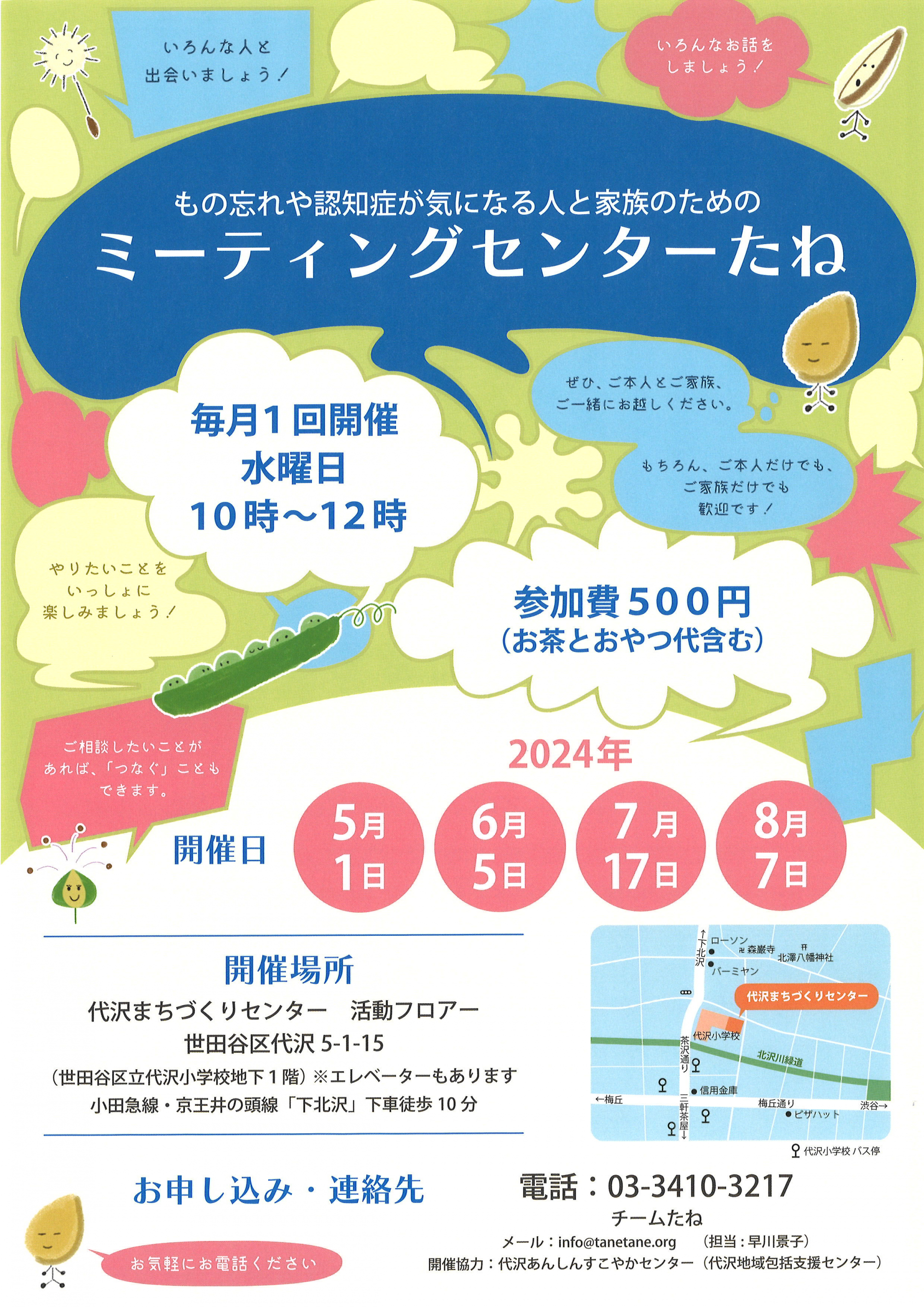 ミーティングセンターたねの対象は、もの忘れや認知症が気になる方やそのご家族です。