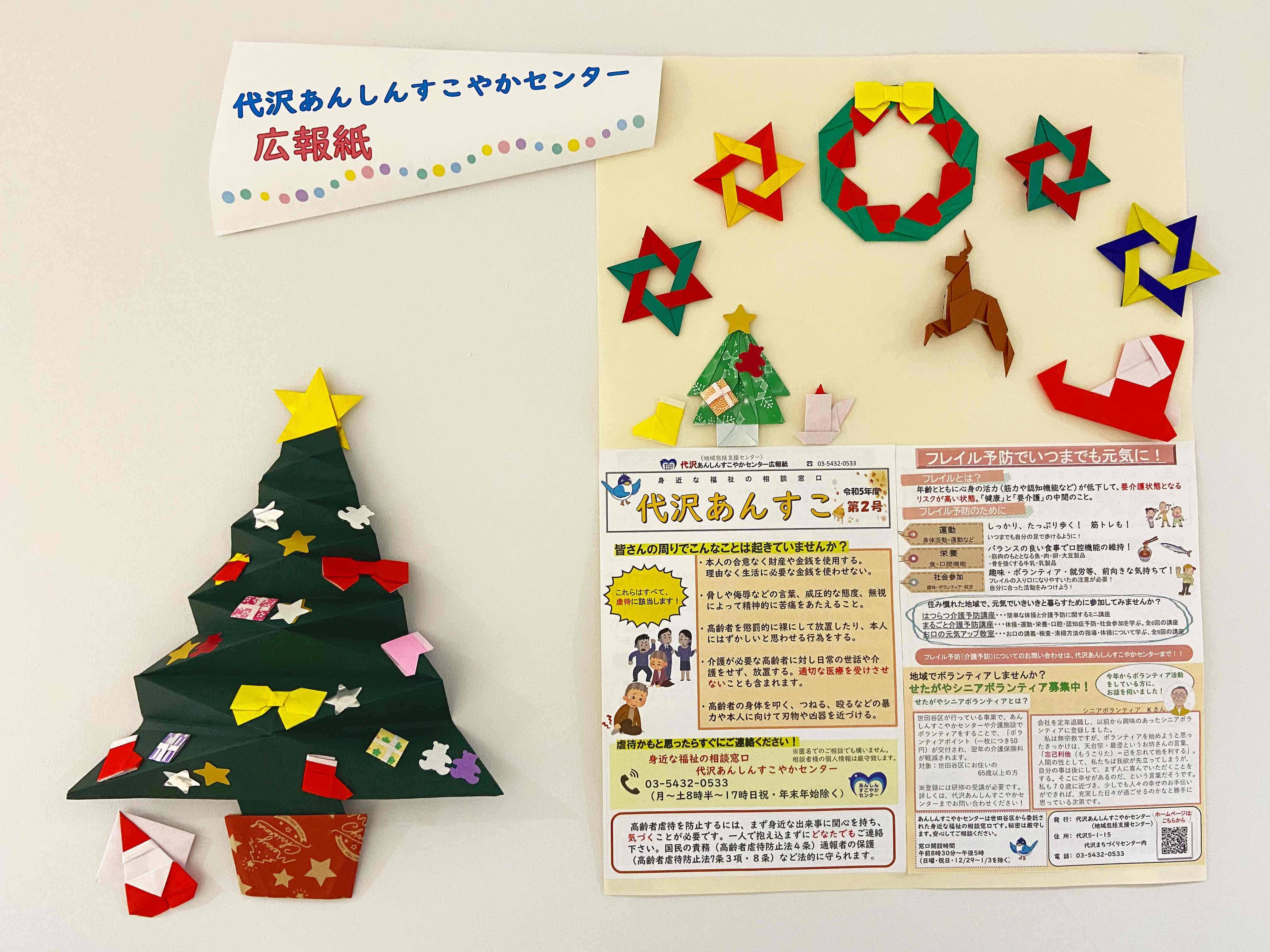 広報紙の横にはクリスマスツリーを飾りました。こちらも折り紙でできています!