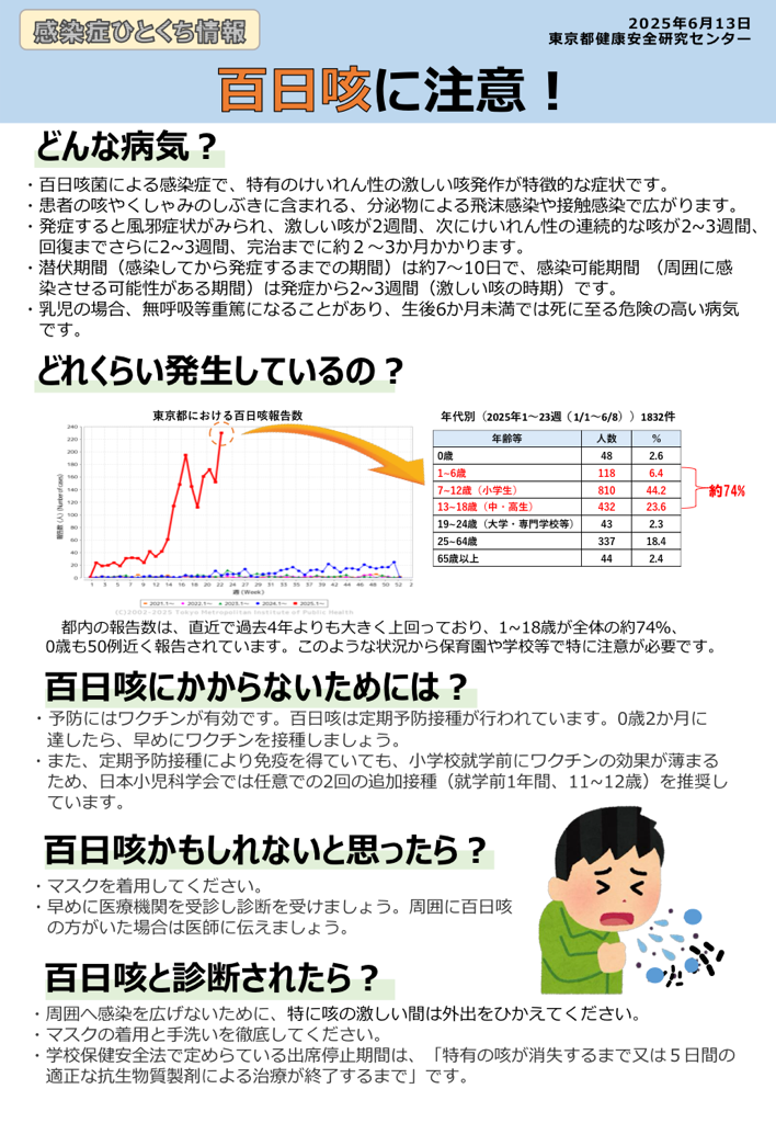 現在、百日咳が流行しており、東京都から注意喚起がされております。