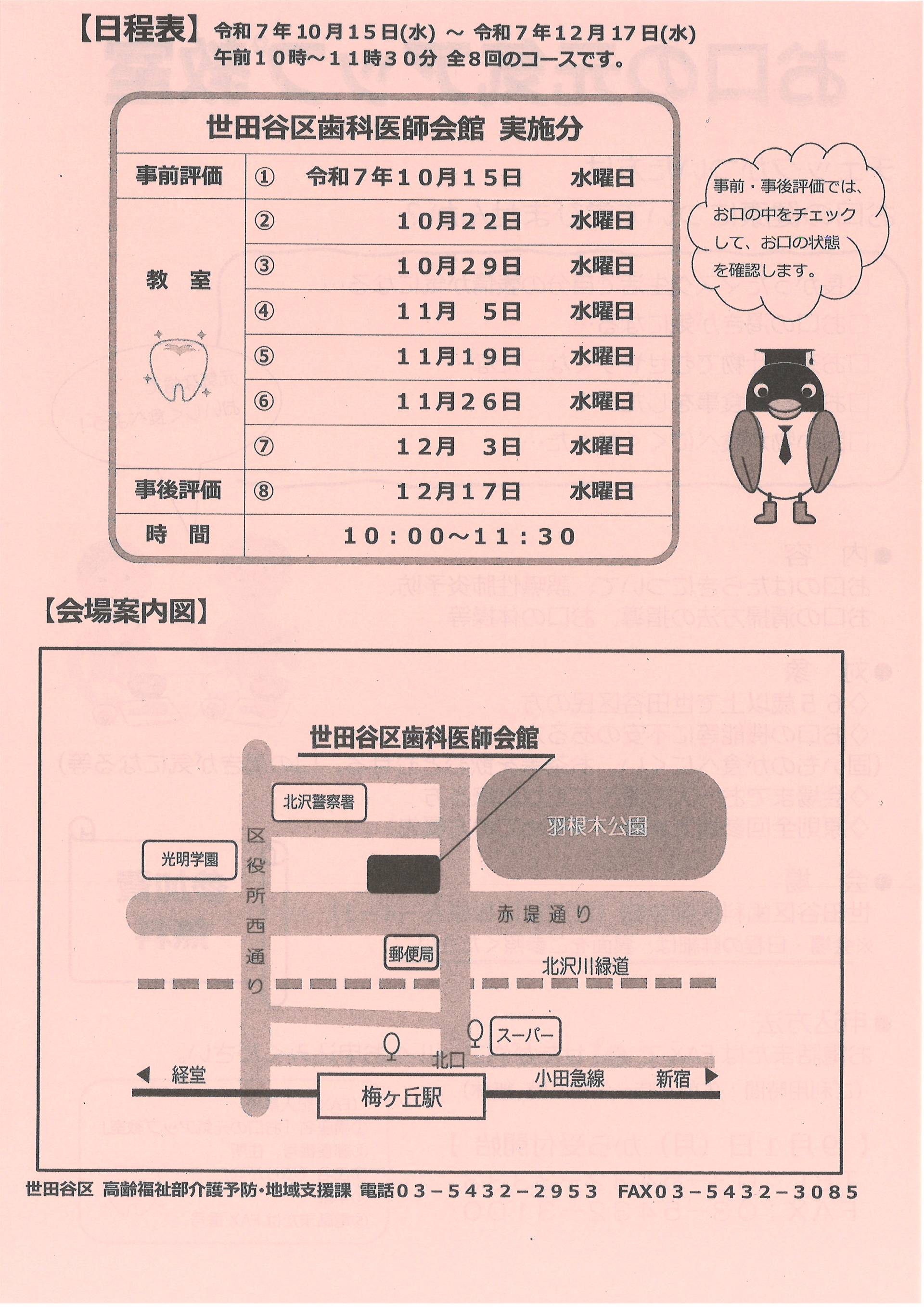 世田谷区では「お口の元気アップ教室」を開催しています。詳細は下記チラシをご確認ください。
