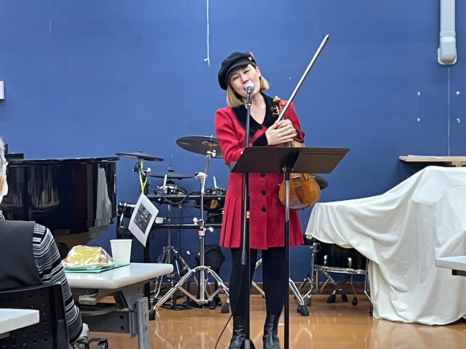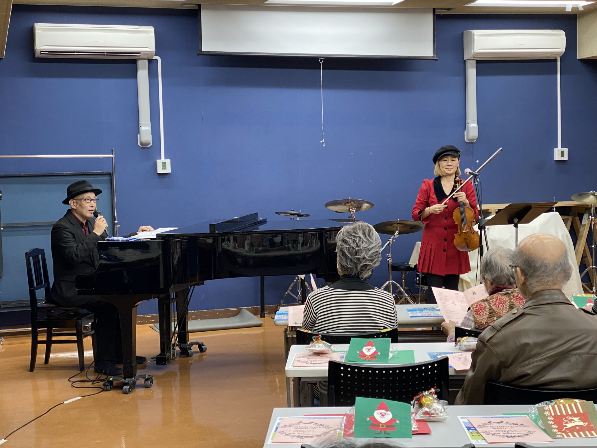 今回はクリスマスコンサートということで、バイオリンと歌、そしてピアノの演奏を参加者の皆さんと一緒に楽しみました。