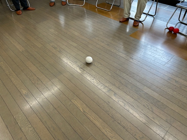 白いボール目掛けて、赤チームのボールと青チームのボールを順番に投げ合います。