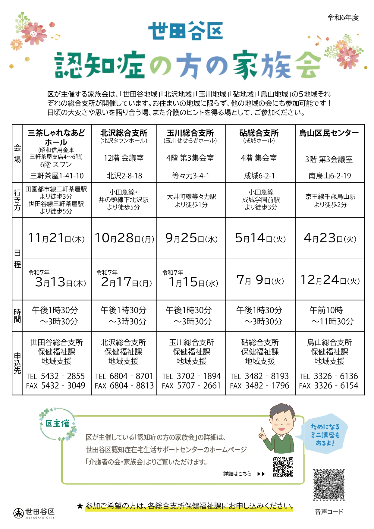 【代沢包括】令和6年度 区主催「世田谷区認知症の方の家族会」のご案内