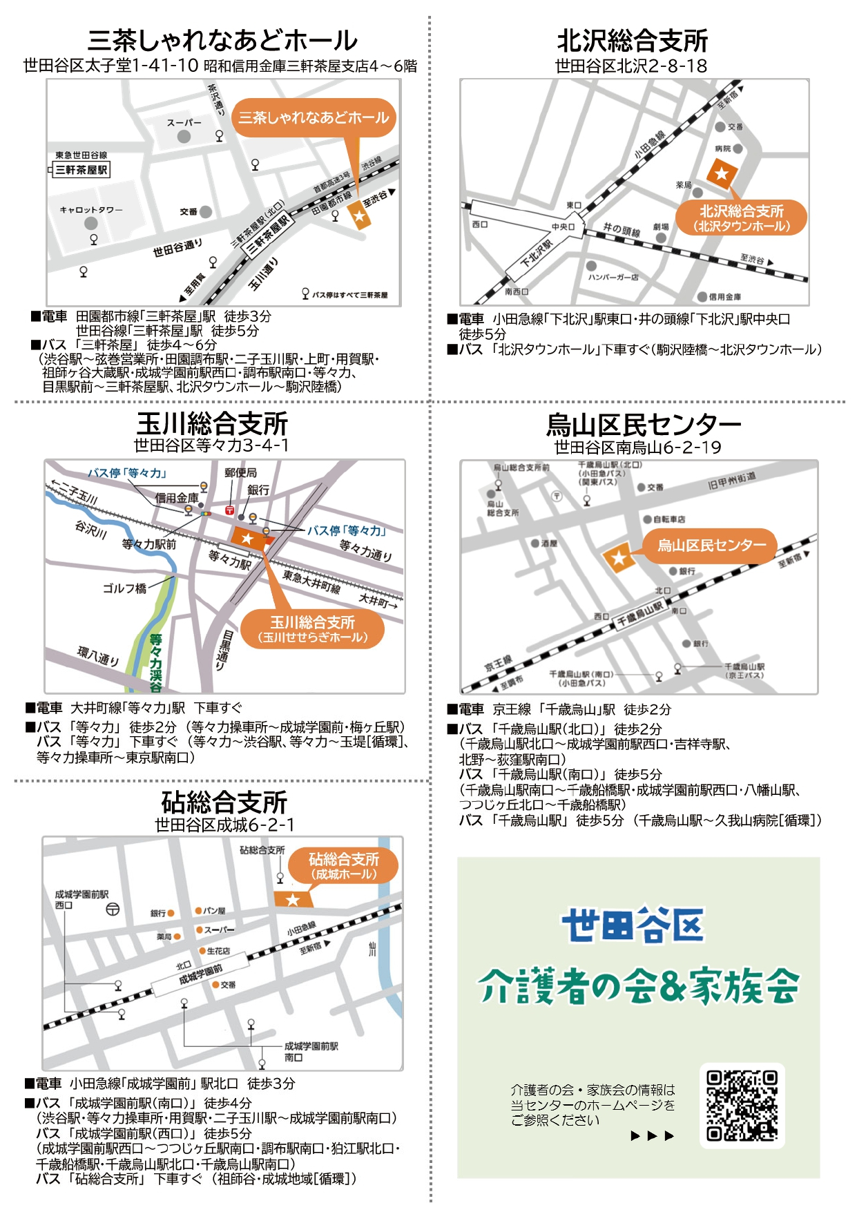 世田谷区では「世田谷地域」「北沢地域」「玉川地域」「砧地域」「烏山地域」の5地域それぞれの総合支所で、区主催の家族会を開催しています。