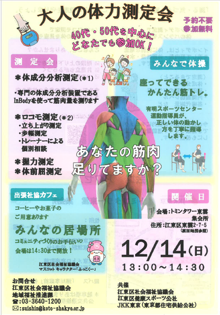 2025.11.18 【枝川包括】枝川長寿サポートセンター 一時移転終了のお知らせ お知らせ #一時移転終了 #枝川長寿サポートセンター 2025.11.18 【枝川包括】体力測定会に参加してみませんか? お知らせ #体力測定会 #社協カフェ #かんたん筋トレ 2025.11.17 【枝川包括】ボランティアまつりが開催されます! お知らせ #江東区ボランティアまつり #地域貢献活動 2025.11.15 【枝川包括】アルコール関連問題啓発の展示です お知らせ #アルコール # アルコール依存症 #アルコール問題相談 2025.11.12 【枝川包括】11月は酉の市 お知らせ #イベント #祭 #おでかけ #介護予防 2025.11.11 【枝川包括】感染症予防の取組み 活動報告 #予防接種 #感染症予防 #枝川包括 2025.11.06 【枝川包括】窓口の掲示を模様替えしました♪ お知らせ #枝川包括 #体操 #理学療法 2025.11.05 【枝川包括】クリスマスイルミネーション始まっています お知らせ #クリスマスイルミネーション #おでかけ #介護予防 2025.10.31 【枝川包括】『まちづくり話し合いひろば』のお知らせ お知らせ #枝川包括 #まちづくり #ワークショップ 2025.10.30 【枝川包括】認知症本人ミーティングのお知らせ お知らせ #枝川包括 #認知症 #本人ミーティング 2025.10.30 【枝川包括】江東区認知症ガイドブック改訂作業中です 活動報告 2025.10.30 【枝川包括】Youtubeで参加できるくらしの連続講座 ご案内(11/17〆切) お知らせ 2025.10.30 【枝川包括】豊洲シビックセンター1階ギャラリーの活き粋体操にご参加ください お知らせ 2025.10.29 【枝川包括】江東区主催 認知症サポーター養成講座の講師をつとめました 活動報告 #枝川包括 #認知症サポーター養成講座 # 支え合い 2025.10.28 【枝川包括】枝川出張相談会を開催しました 活動報告 #枝川出張相談会 #KOTO活き粋体操 1 2 3 4 … 35