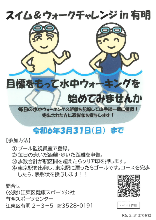 2024.03.02 お知らせ スイム&ウォークチャレンジ有明のお知らせです【枝川包括】 Tweet シェアする スイム&ウォークチャレンジ有明のお知らせが届きました! ご興味のある方はぜひご参加ください。案内は窓口にも設置していますのでご覧ください。 前の記事 2024.03.02 お知らせ 地震に備えましょう【枝川包括】 次の記事 2024.02.27 お知らせ 春はそこまで【枝川包括】 一覧へ戻る