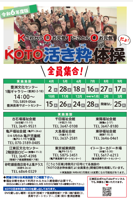 2024.03.20 お知らせ 来月のKOTO活き粋体操は4/2です!【枝川包括】 Tweet シェアする 来月の豊洲KOTO活き粋体操は4/2(火)です。 来年度以降も毎月実施予定です。 ぜひご参加ください。 前の記事 2024.03.20 お知らせ 3月24日は世界結核デー【枝川包括】 次の記事 2024.03.18 お知らせ 国際森林デー2024中央行事のご案内【枝川包括】 一覧へ戻る