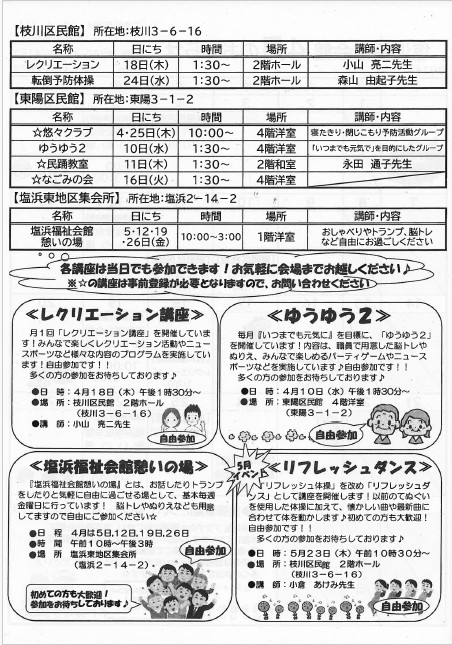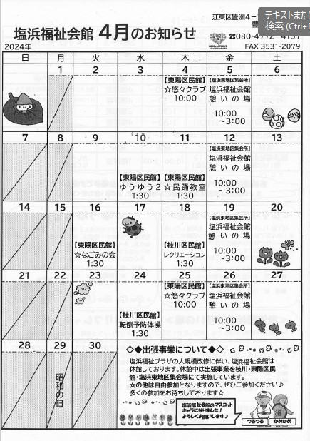 2024.04.03 お知らせ 塩浜福祉会館からのお知らせです【枝川包括】 Tweet シェアする 塩浜福祉会館から4月の行事等のお知らせです。 詳しくは下記案内をご覧ください。 前の記事 2024.04.04 お知らせ 介護予防防災ウォーキング教室(5・6月)【枝川包括】 次の記事 2024.04.01 お知らせ 新年度【枝川包括】 一覧へ戻る